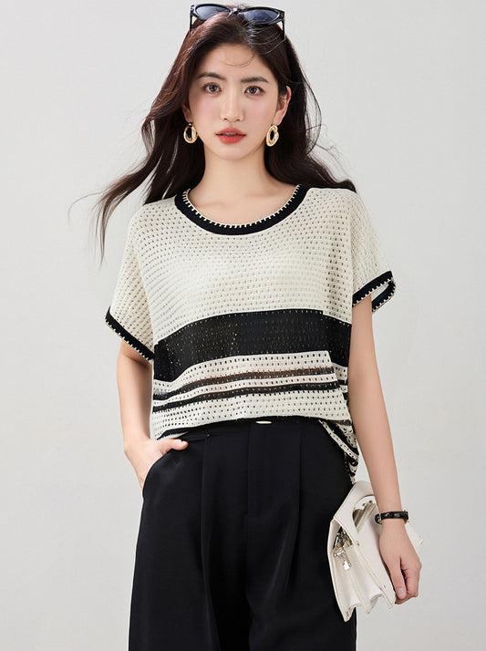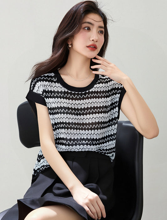 ストライプ半袖ニットトップ