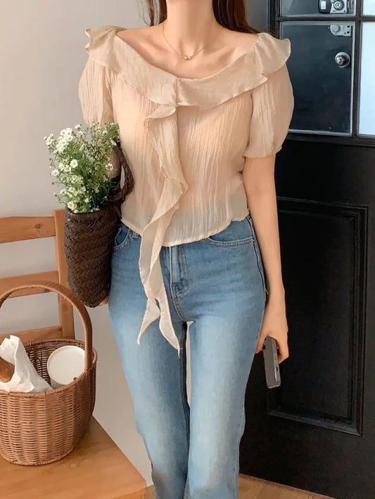 オフショルダー半袖シフォンシャツ