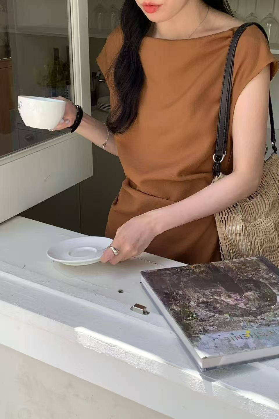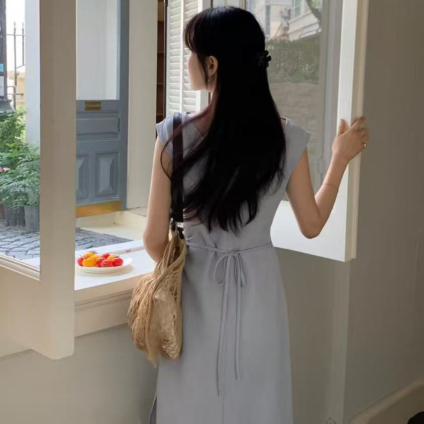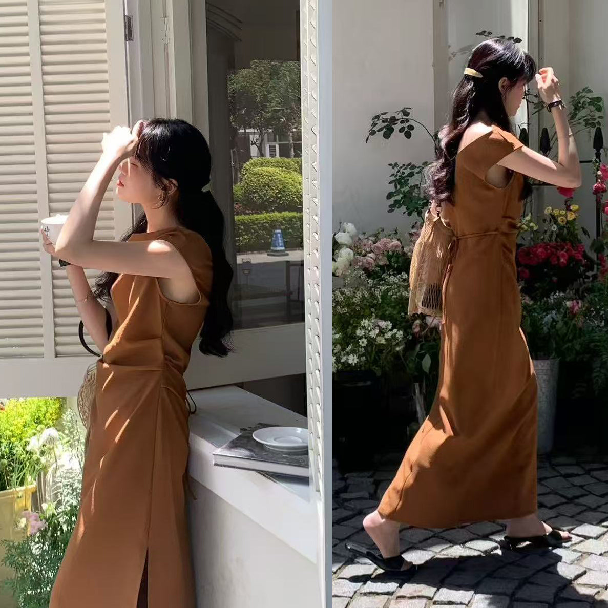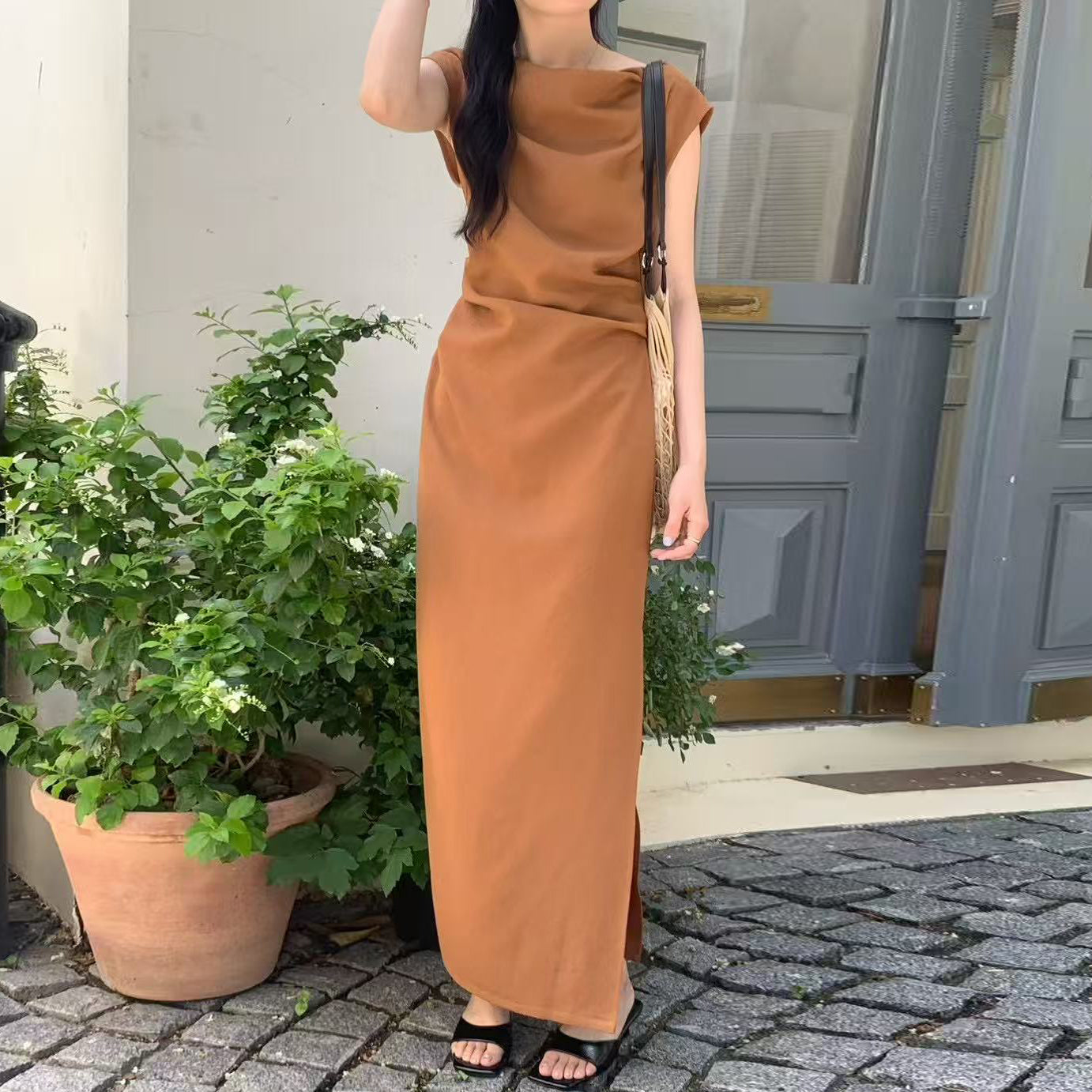 サイズ更新フレンチエレガントシンプルワンラインネックウエストスリムスリットワンピース入荷