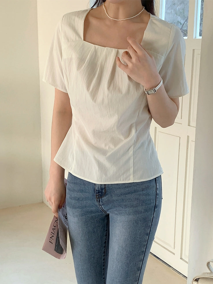 シックな韓国夏フレンチスタイルスクエアネックフリルデザイン半袖オールマッチシャツトップ
