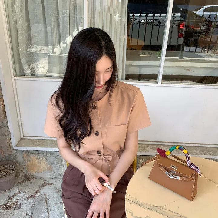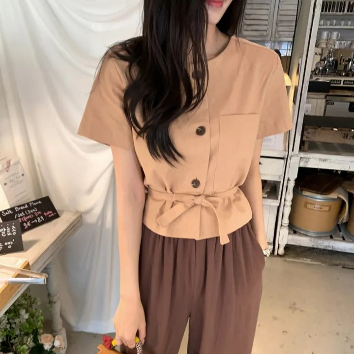 シックな韓国夏レトロファッションラウンドネックカーディガンニッチレースアップウエスト半袖シャツトップ