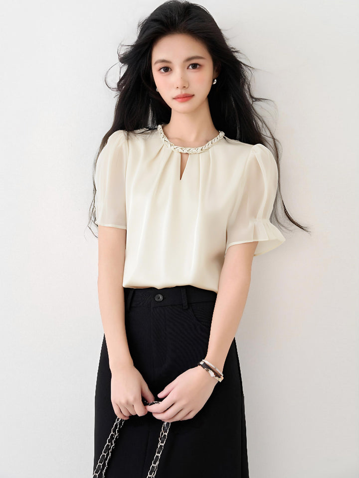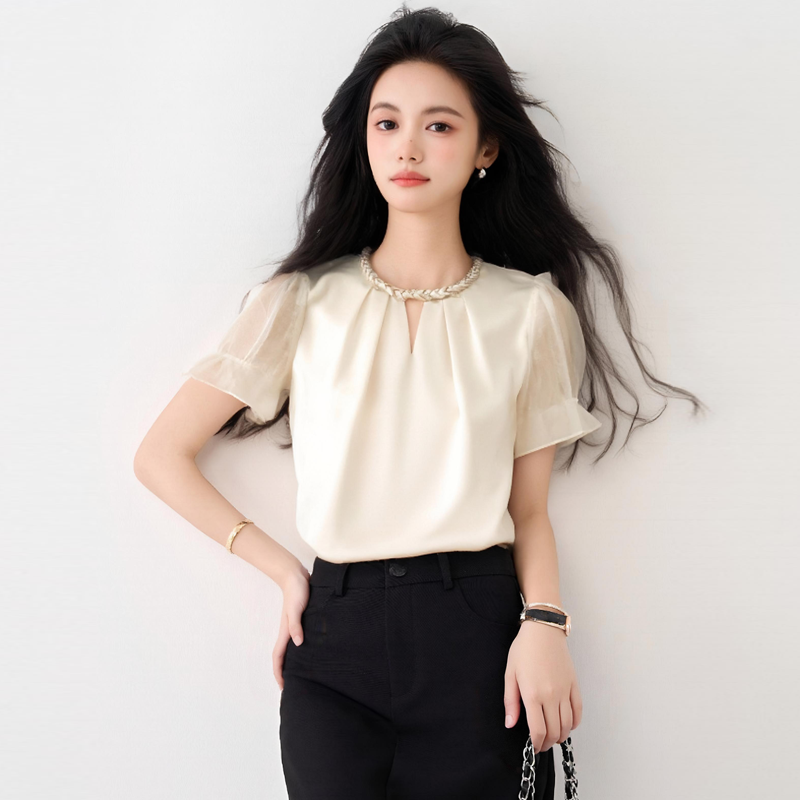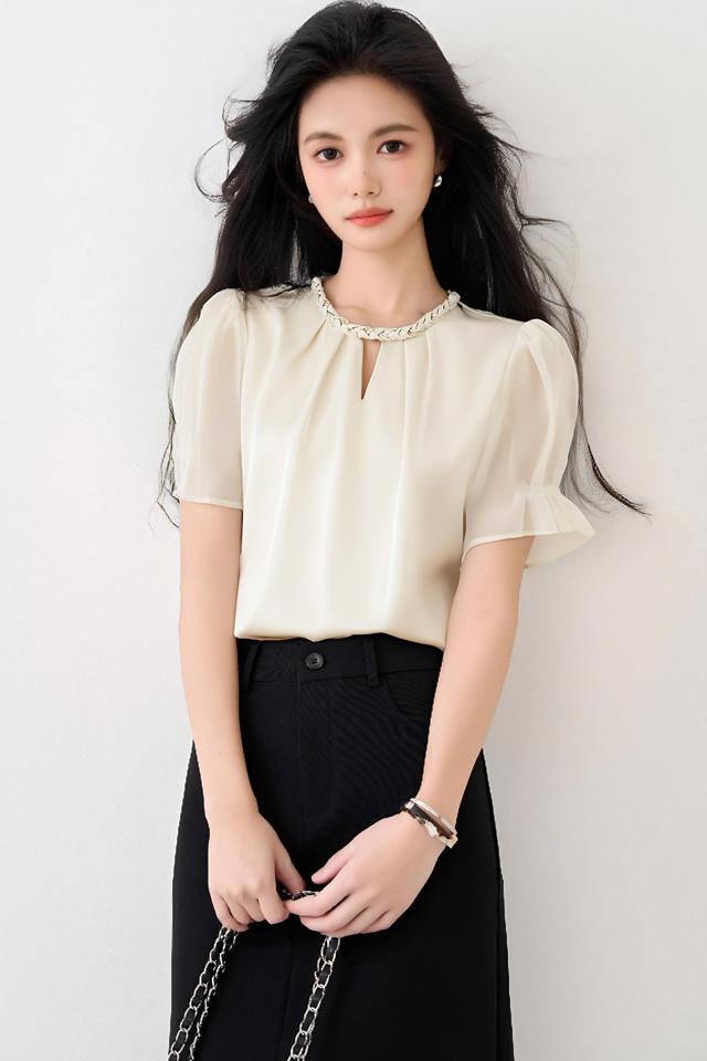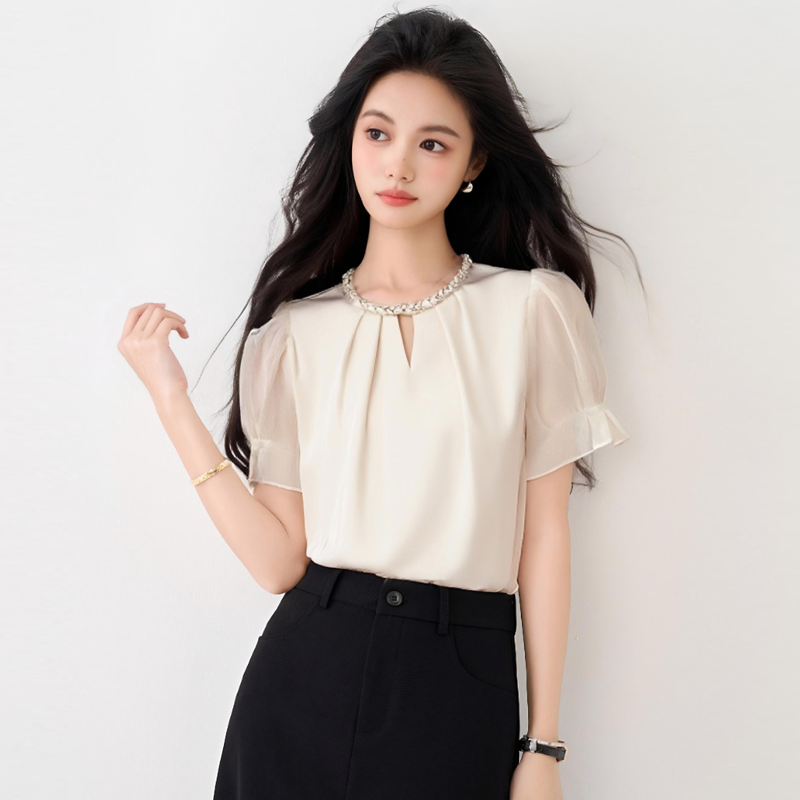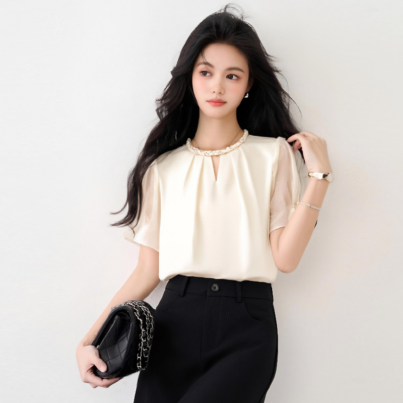 新品サテン半袖シフォンシャツ女性用ウエスタンスタイルシャツ OL プロフェッショナルスリムお腹カバースモールシャツ