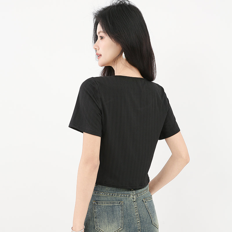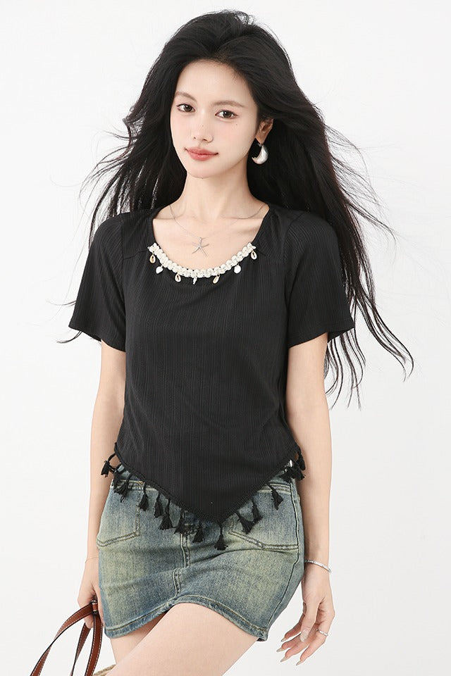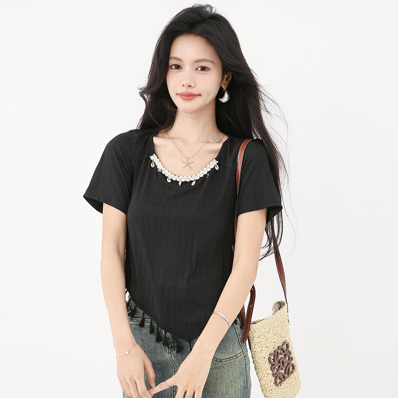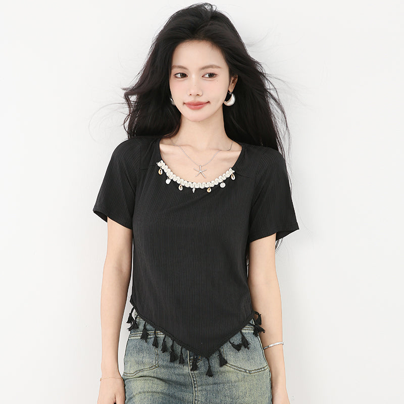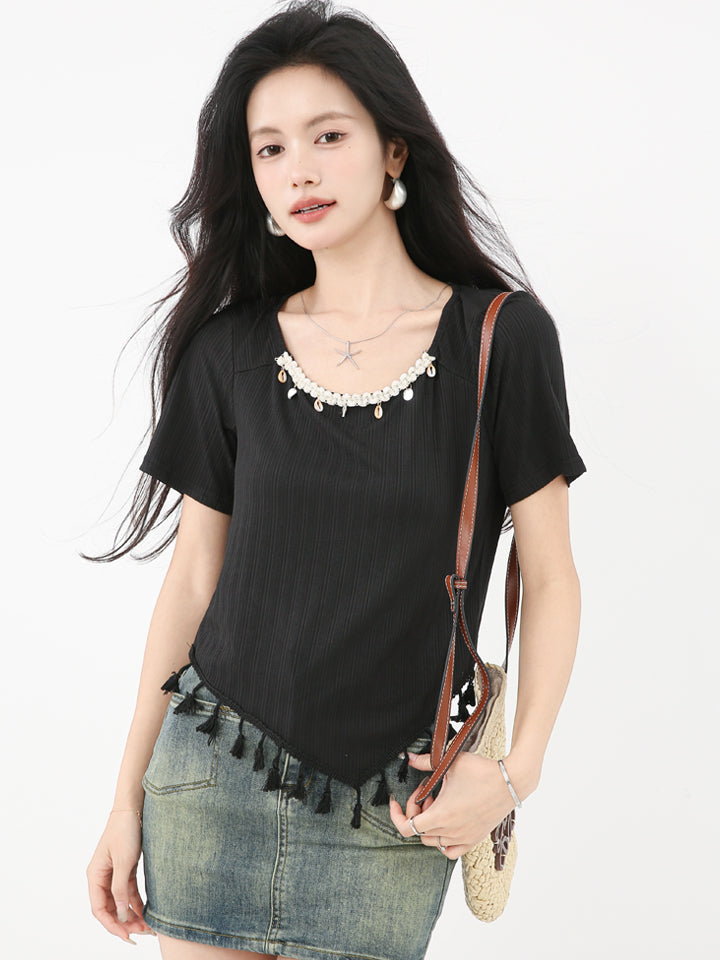 イレギュラースクエアネックフリンジ付き半袖Tシャツ2025夏新作ファットmmスリムウエスタンスタイルショートトップス発送