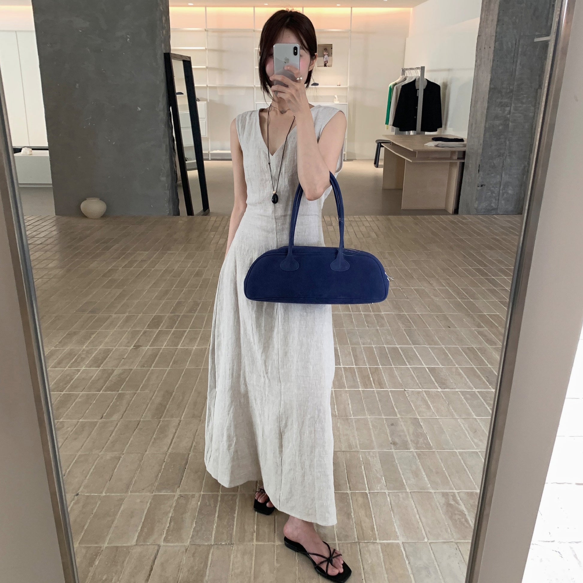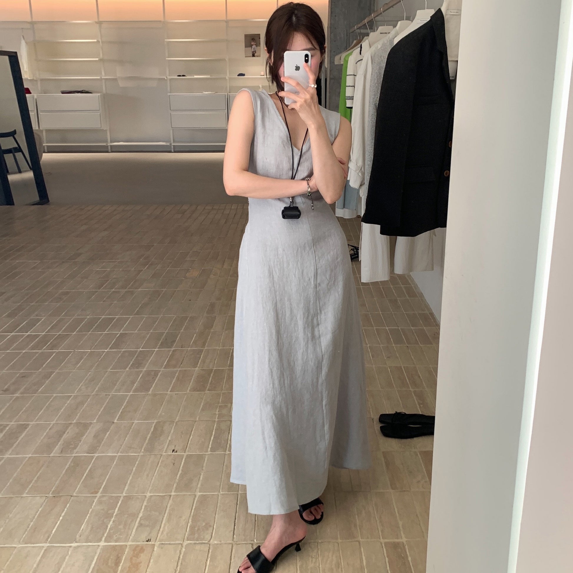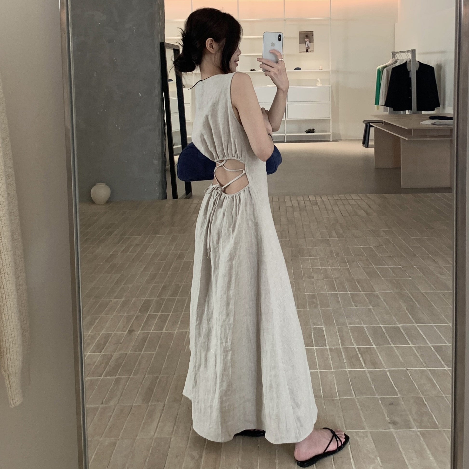 サイズが更新されました、韓国スタイル、高級リネンベストドレス、バックストラップ、ホローホリデードレス、在庫あり
