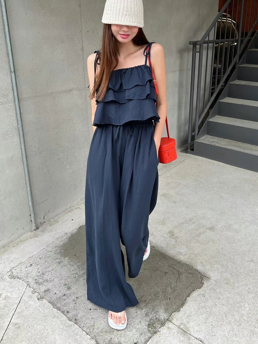 サイズアップした韓国シックエイジリダクションフリルキャミソールシャツ+ハイウエストワイドレッグパンツ