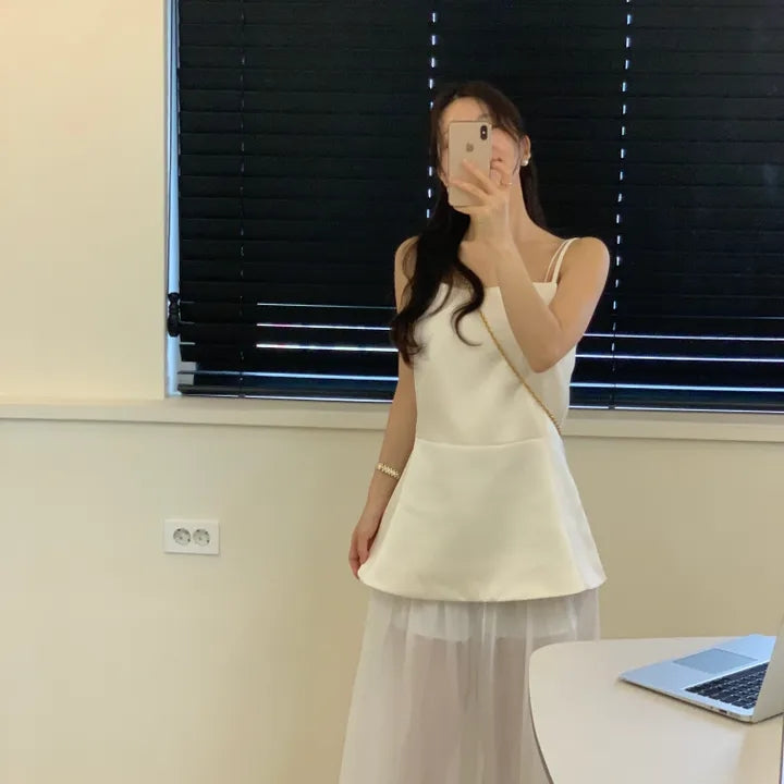 シックな韓国夏スタイルの高級キャミソールハイウエストニッチパッチワークシフォンスカート
