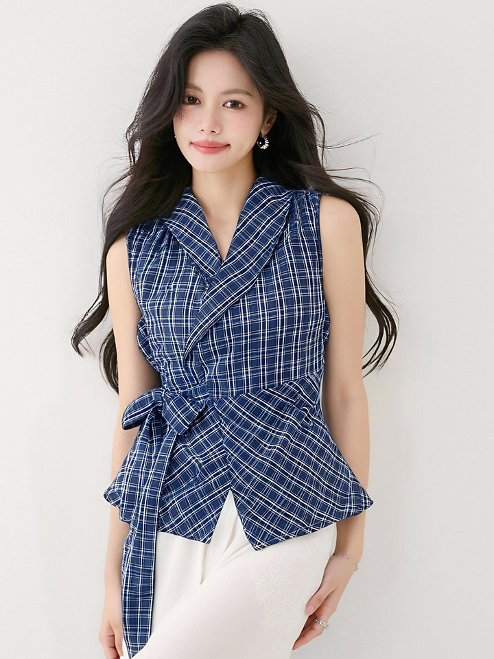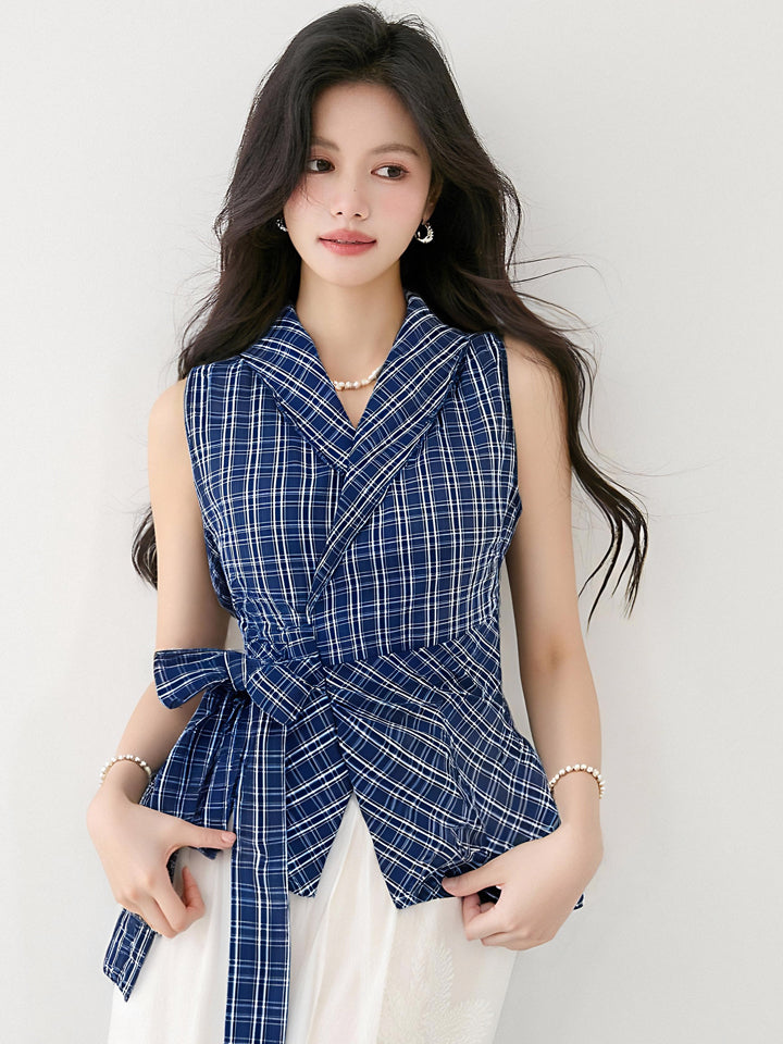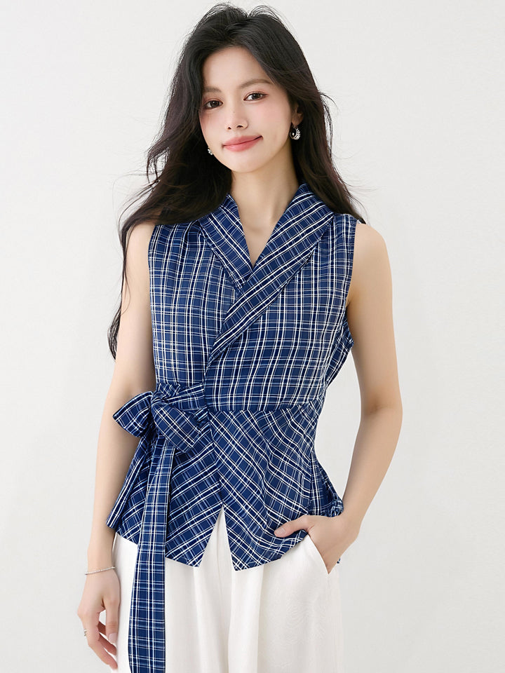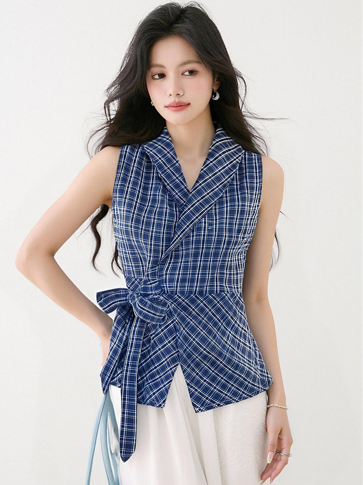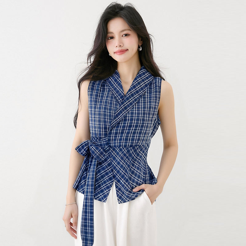 フランス製レトロVネックストラップ付きブルーチェック柄ベストレディース2025年夏新デザインノースリーブトップ