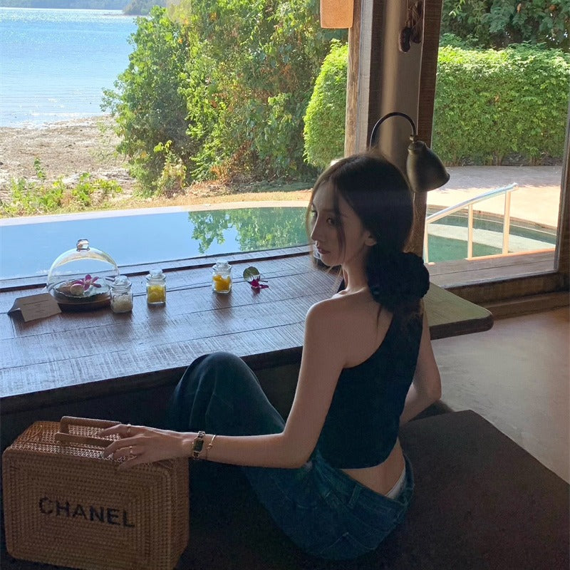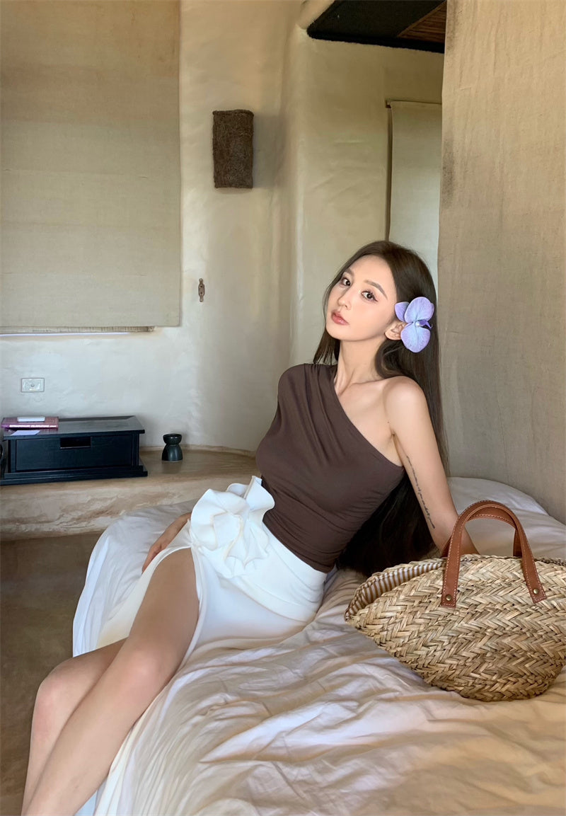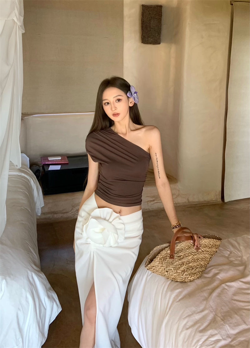 リアルショットお手頃デザインレトロスタイル斜めショルダースリムTシャツトップ