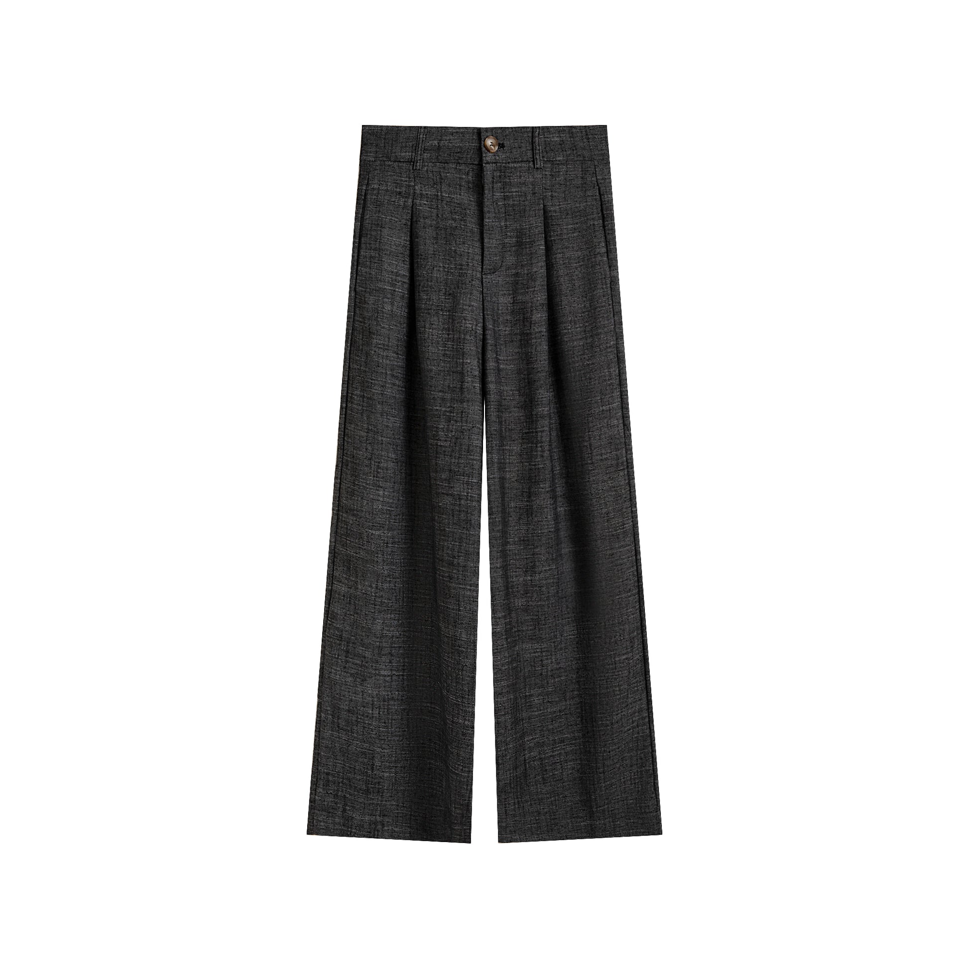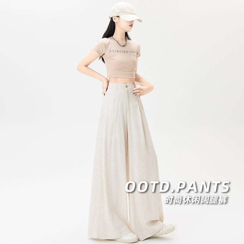 リアルショットのシンプルなスーツパンツ、多用途、高級リネンとコットンのドレープ、スリム、ハイウエスト、ストレートカット、カジュアルワイドレッグレディースパンツ