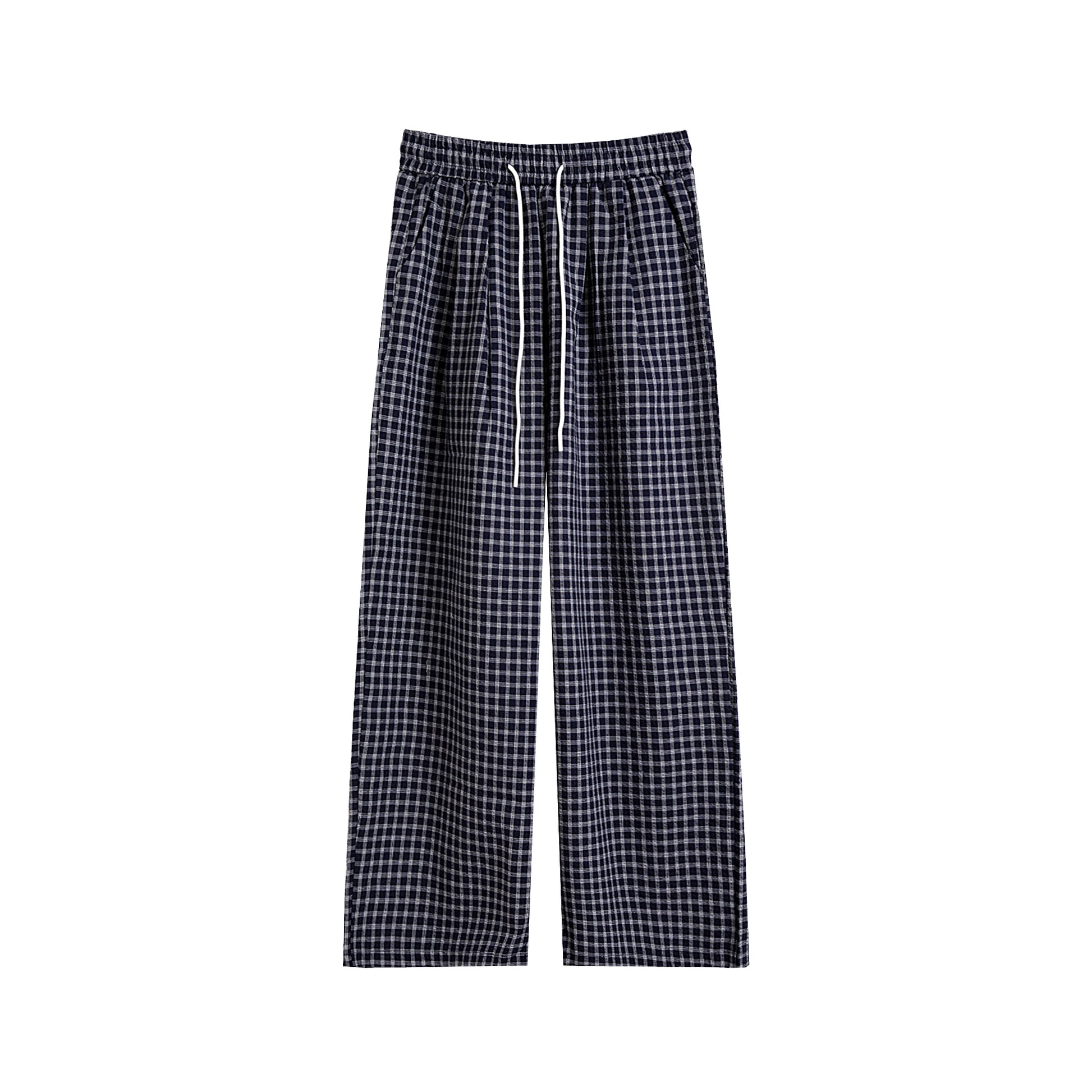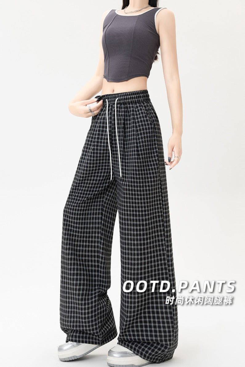 リアルショットシンプルチェック柄バブルラップ速乾ドローストリングハイウエストスリムフィットルーズワイドレッグカジュアルストレートレディースロングパンツ