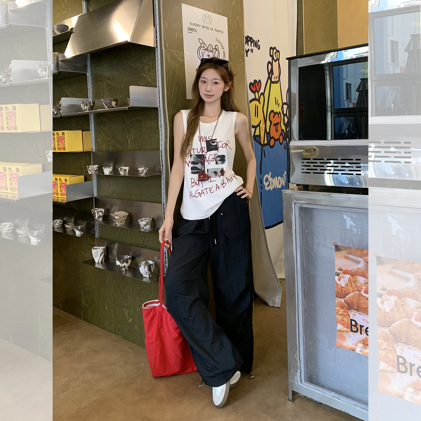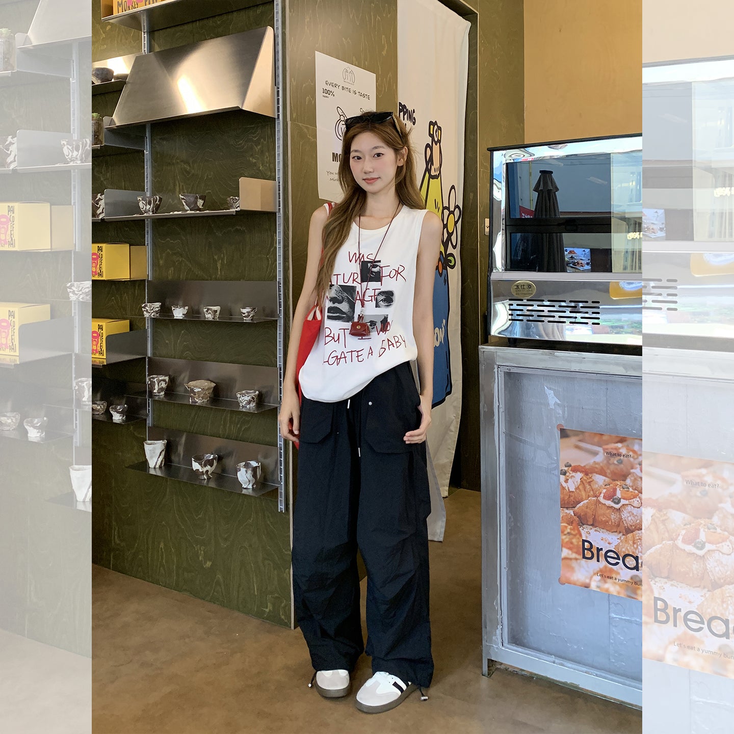 リアルショットリアルプライスアメリカンホットガールレトロプリントラウンドネックスモールキャミソールレディース 2025年夏超かっこいいリトルトップ