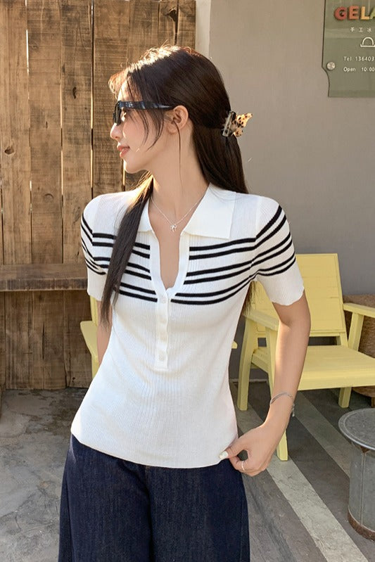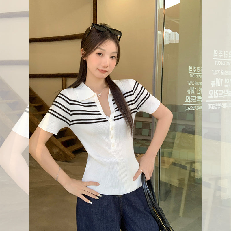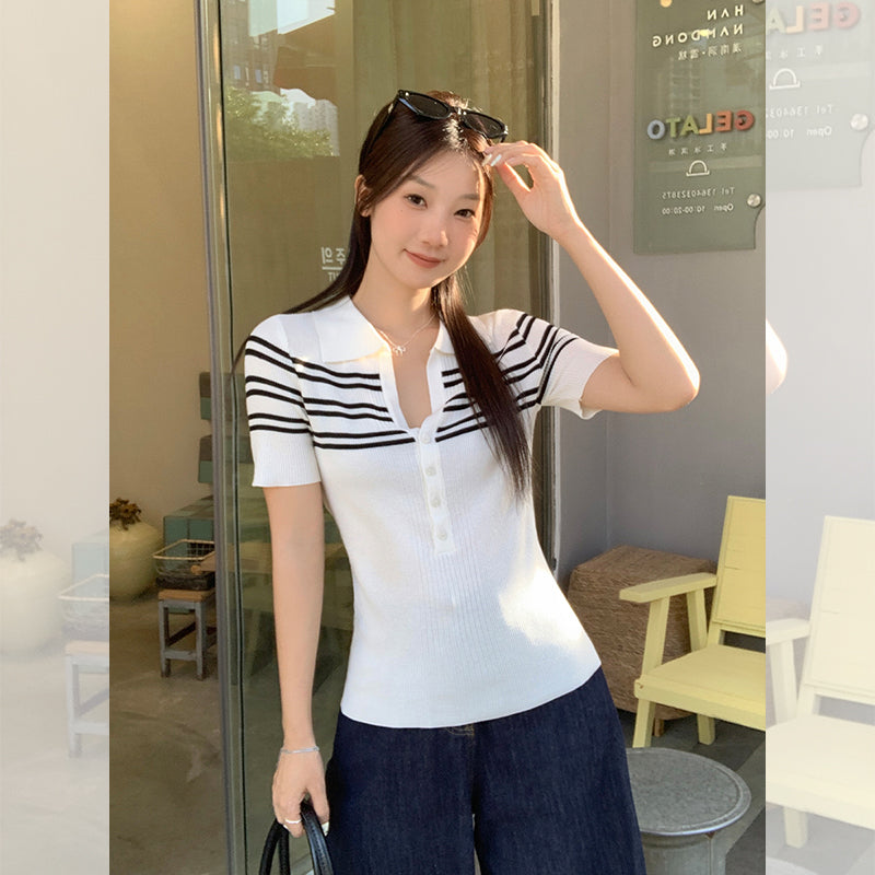 リアルショットリアルプライスボタンラペル半袖ストライプセーターレディース2025年夏新作韓国スリムフィットスリミングスモールトップ