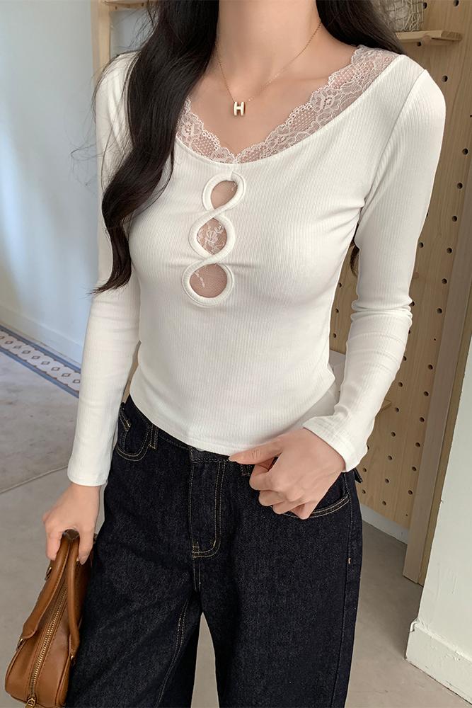 リアルショットリアルプライス韓国風中空Vネック長袖Tシャツ女性用 BMスタイルレースパッチワークトップス丁寧なミシンクロップトップ付き