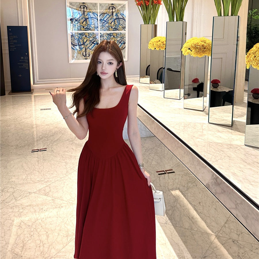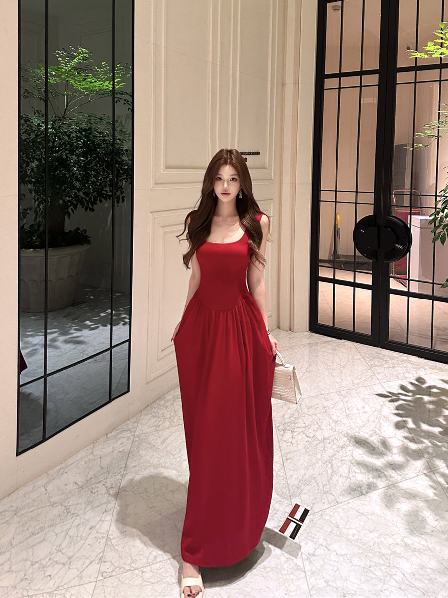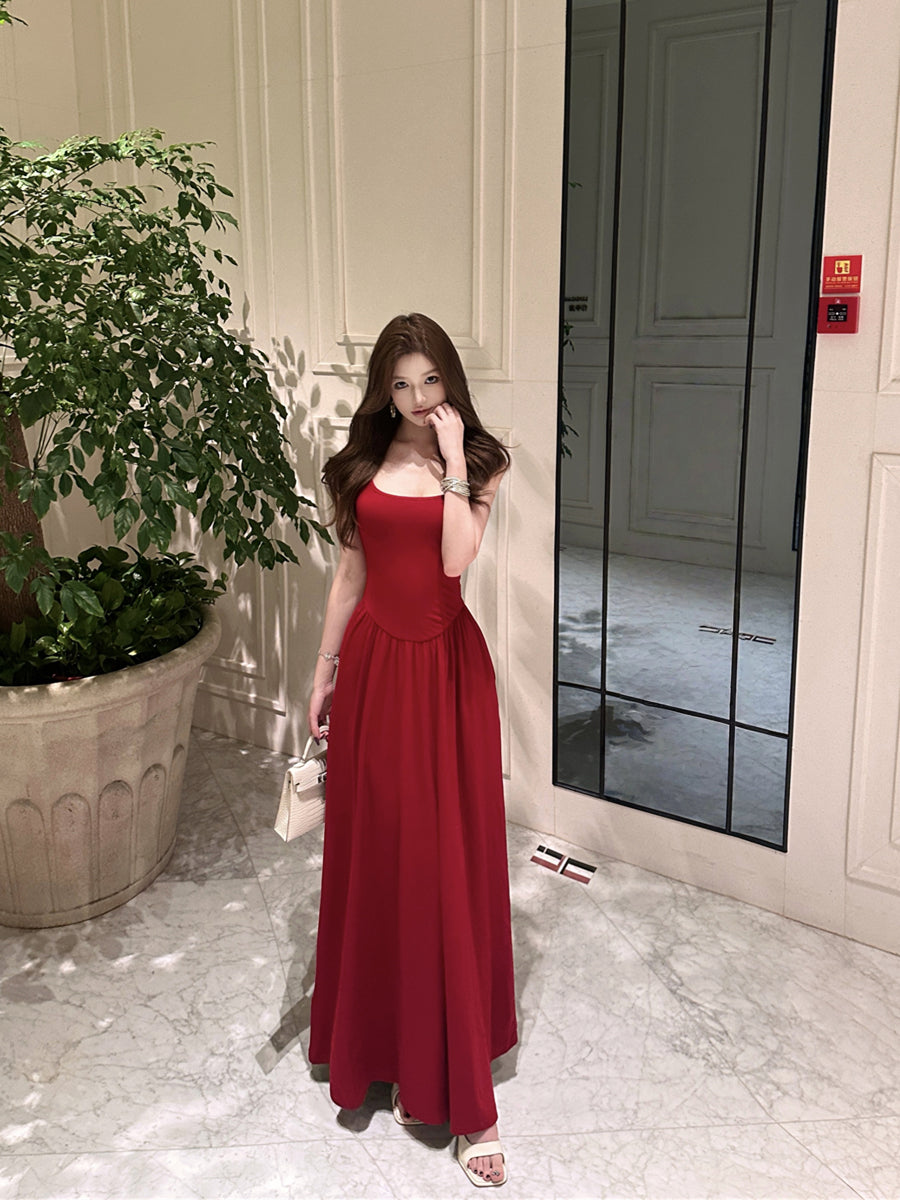 リアルショットレトロセクシーサスペンダーノースリーブウエストスリミングドレスロングドレス女性用