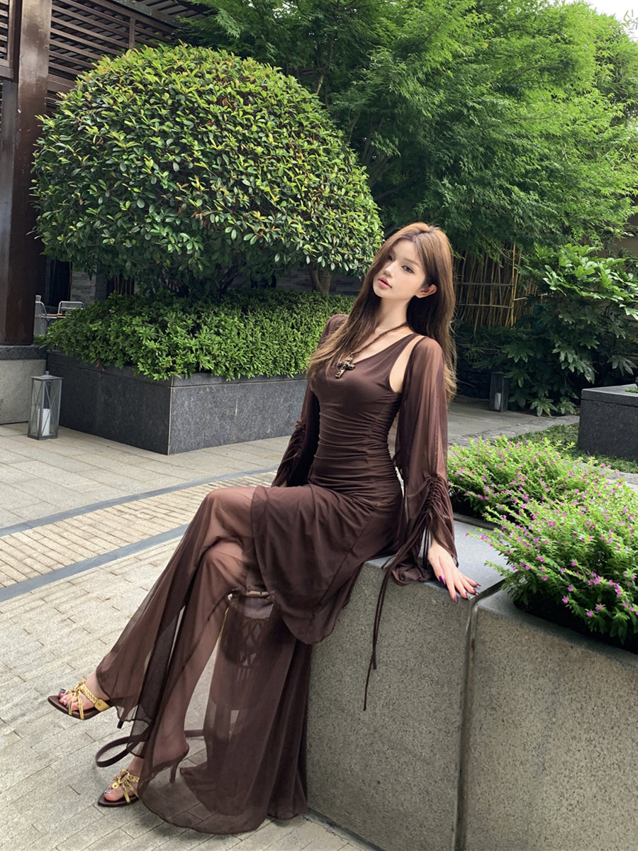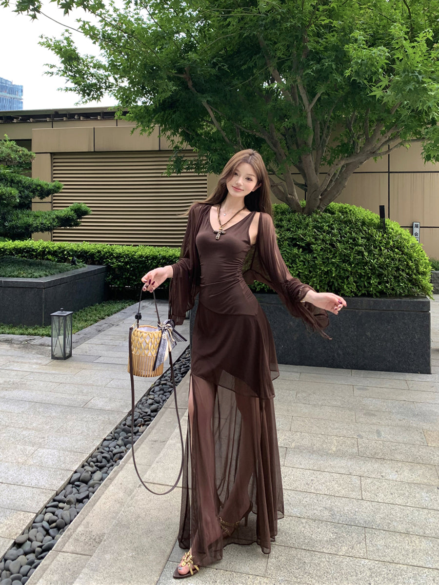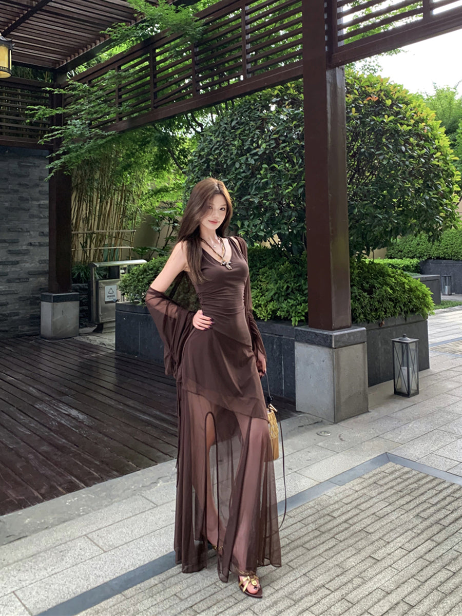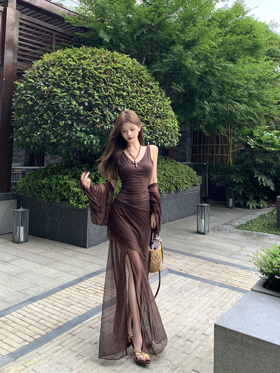 リアルショットレトロセクシーVネックメッシュスリットウエストスリムサスペンダードレス、ヒップラップ付きロングスカート+日焼け止めカーディガン女性用