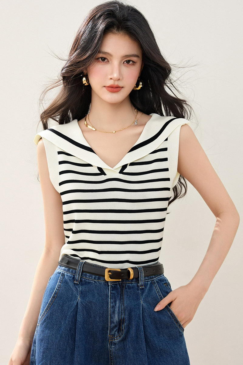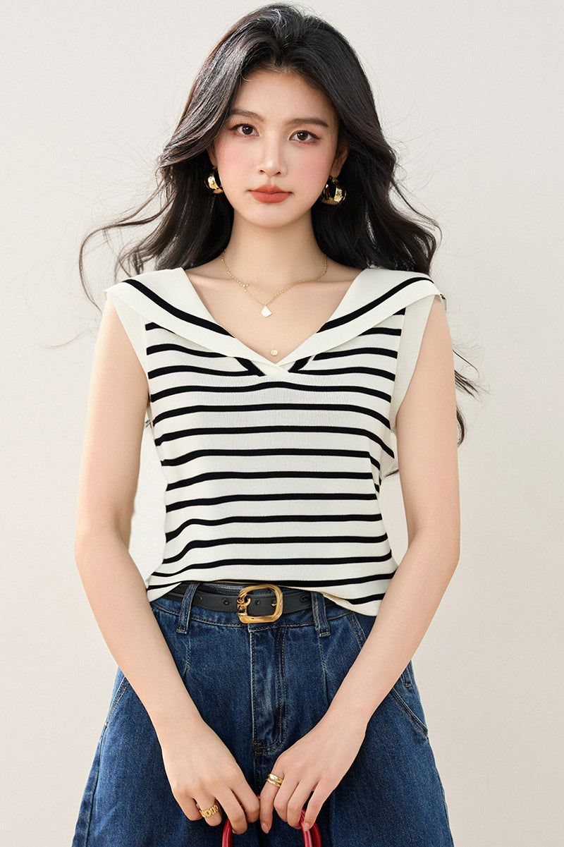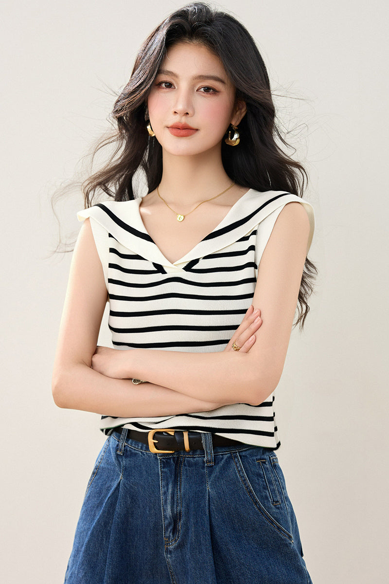 リアルショット◆在庫あり◆デザインネイビーカラーストライプノースリーブベストセーターサマー多目的ニッチトップス女性用