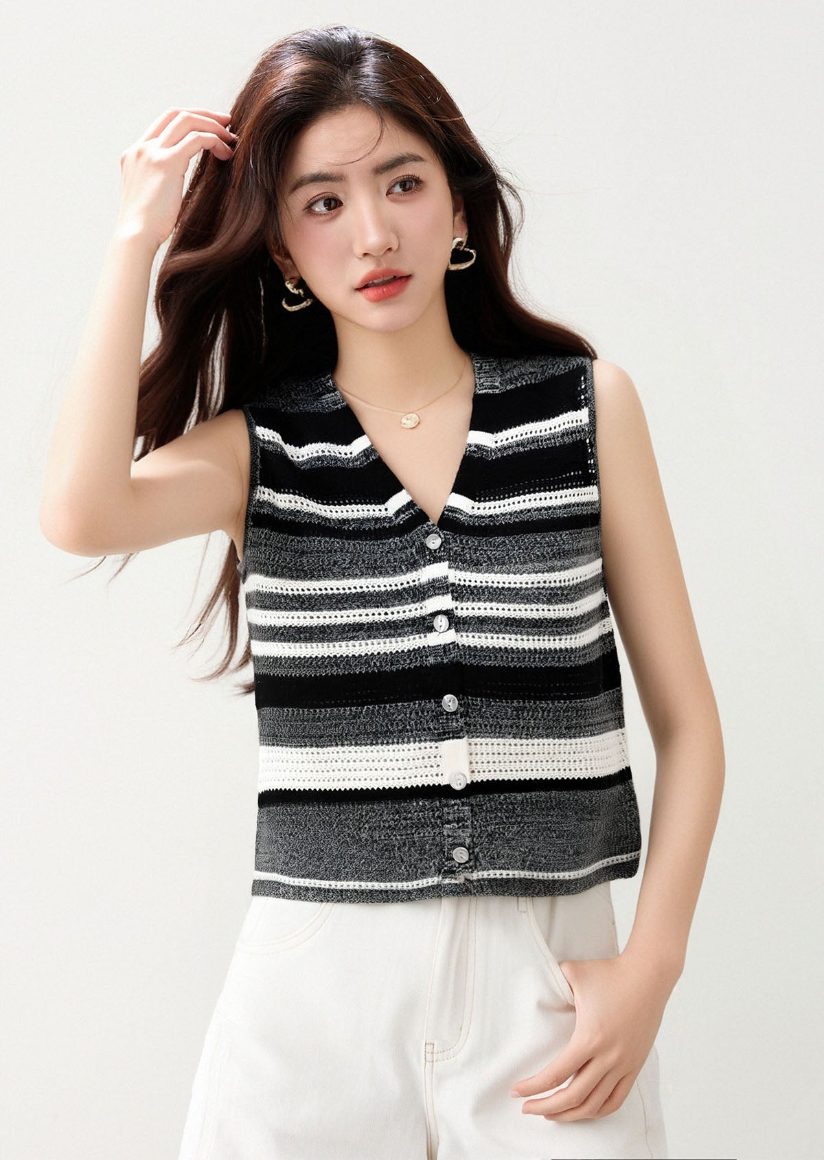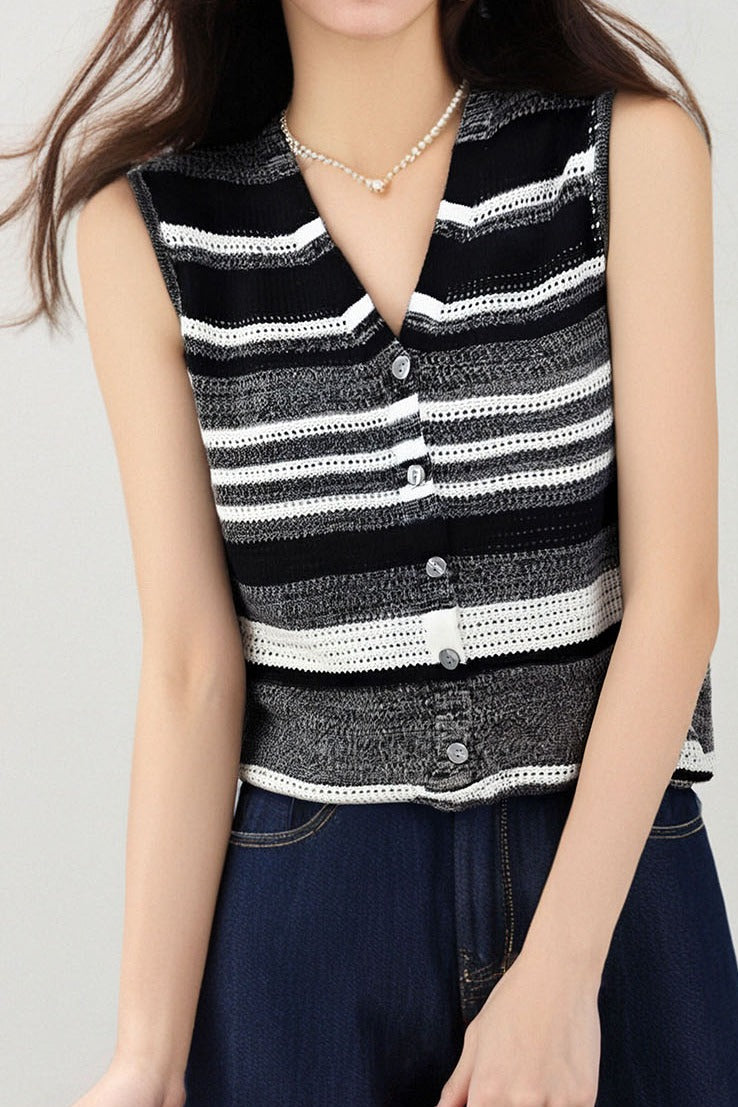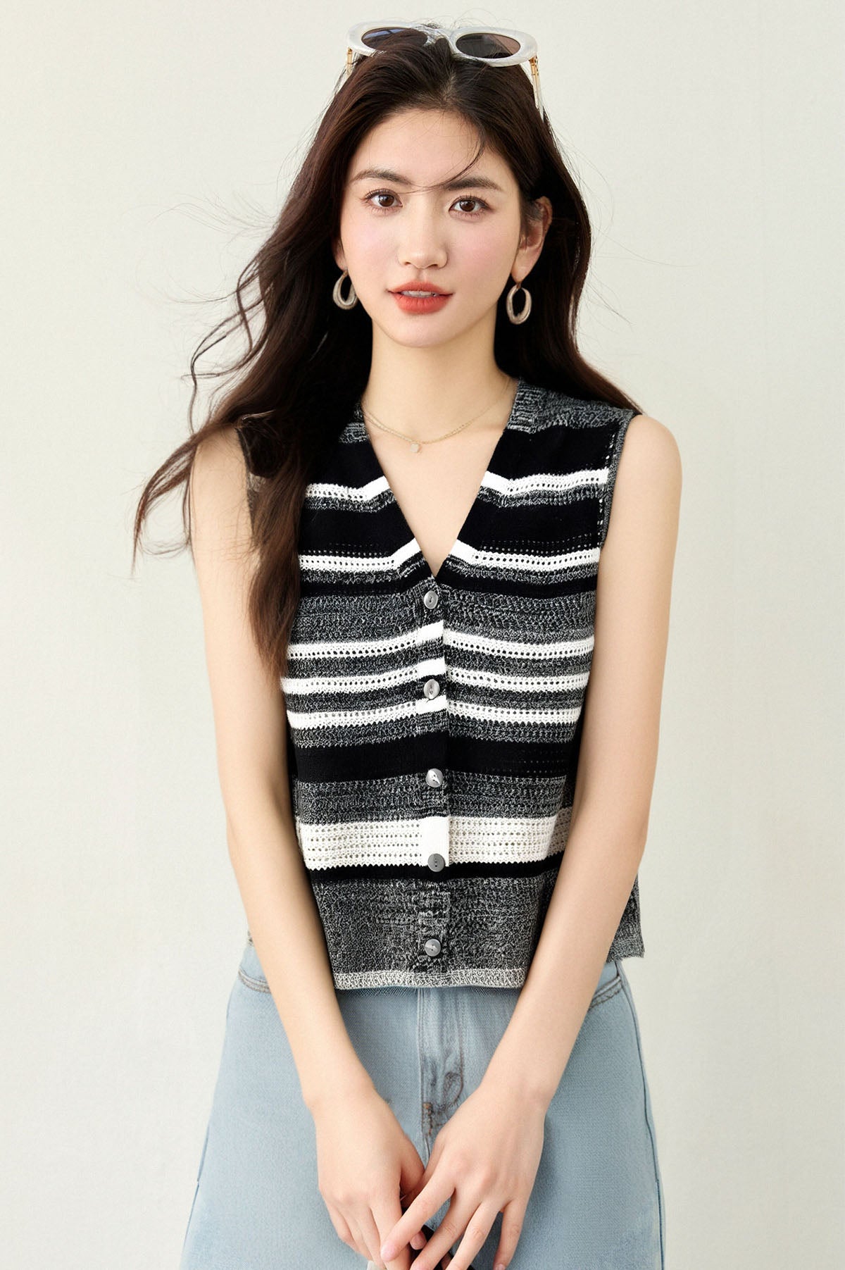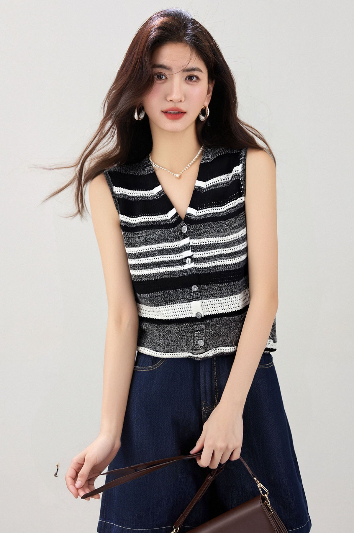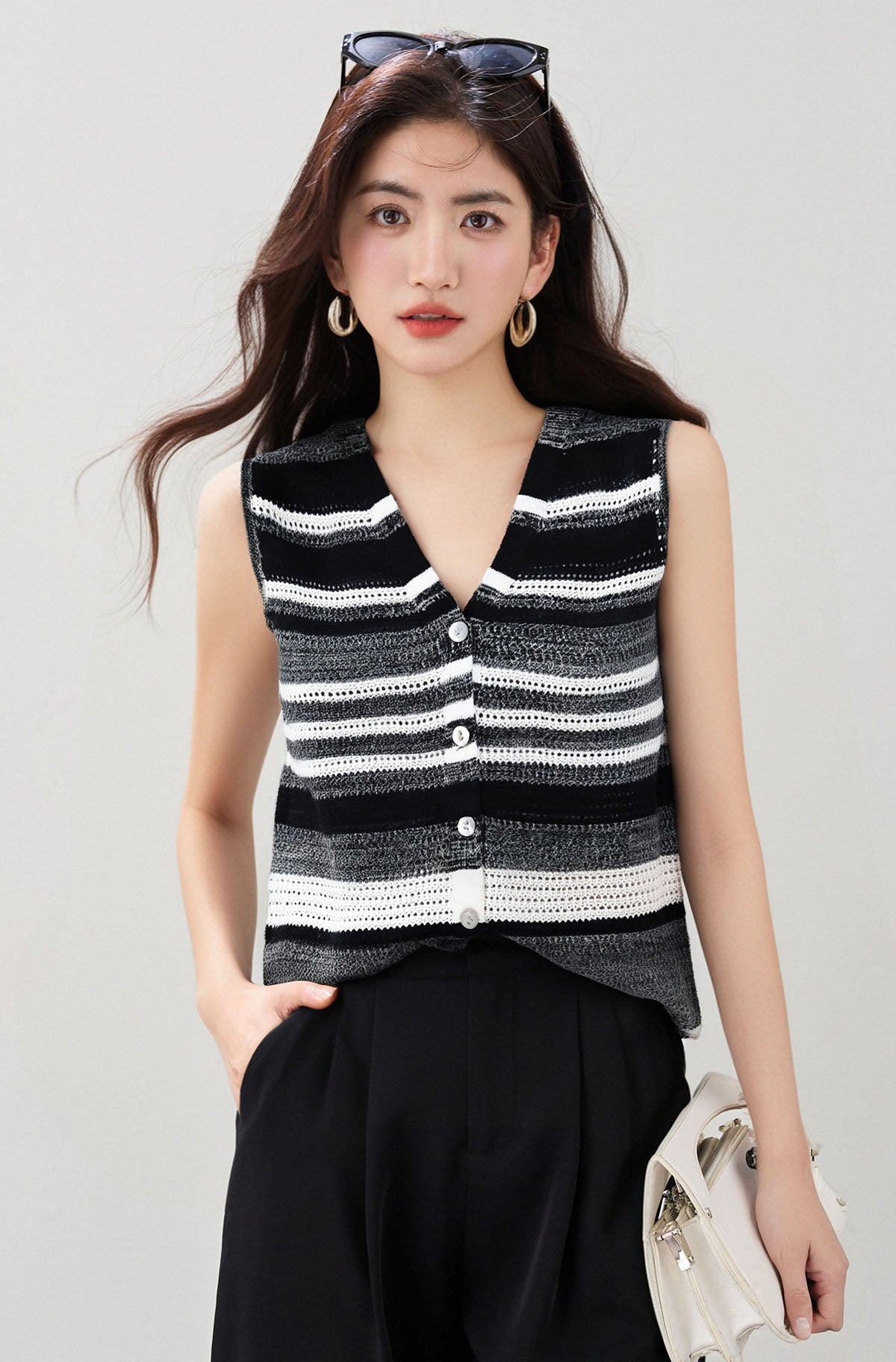 リアルショット◆在庫あり◆Vネックストライプベストカーディガンレディースルーズカジュアルシンショルダーノースリーブシルクコットンベスト