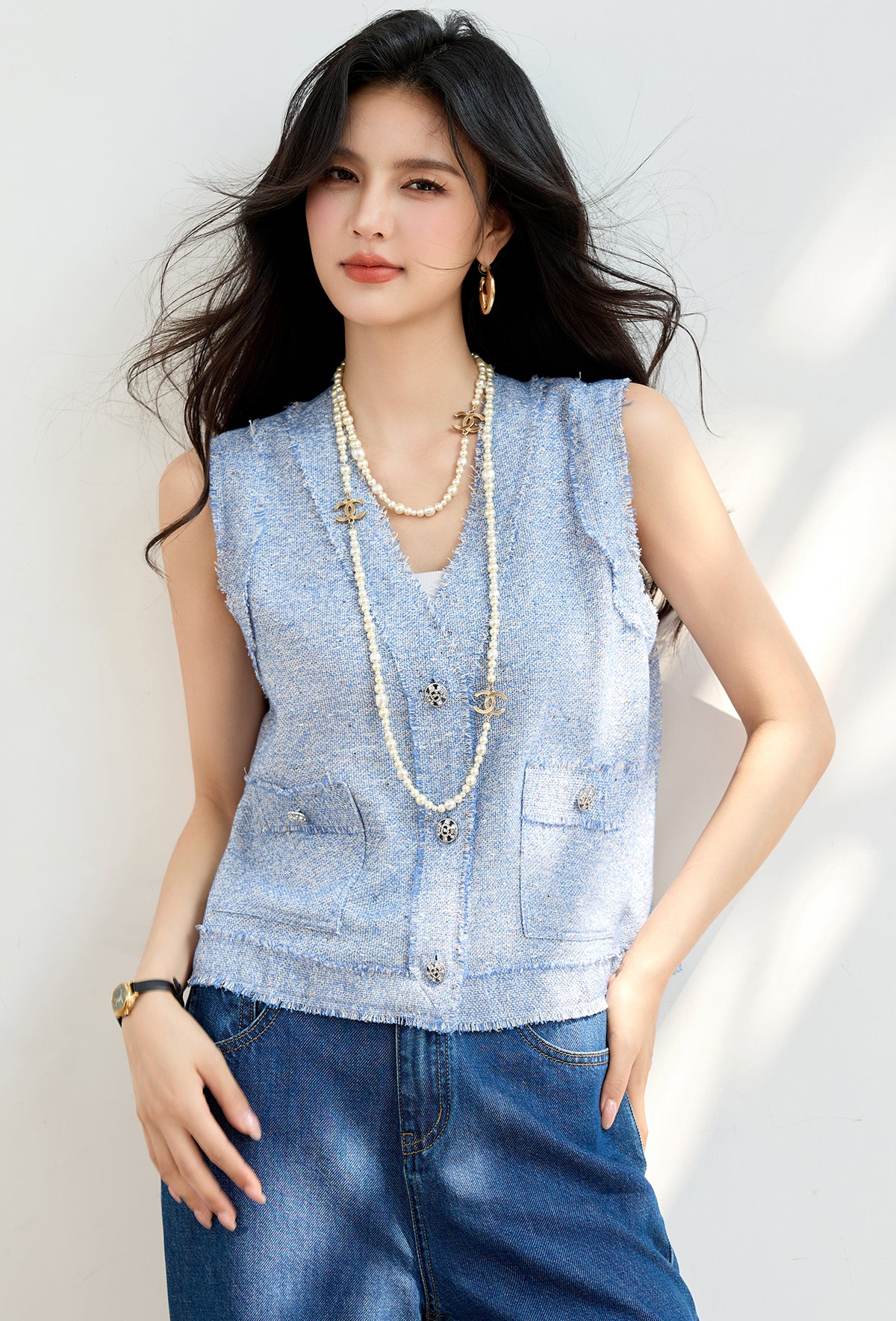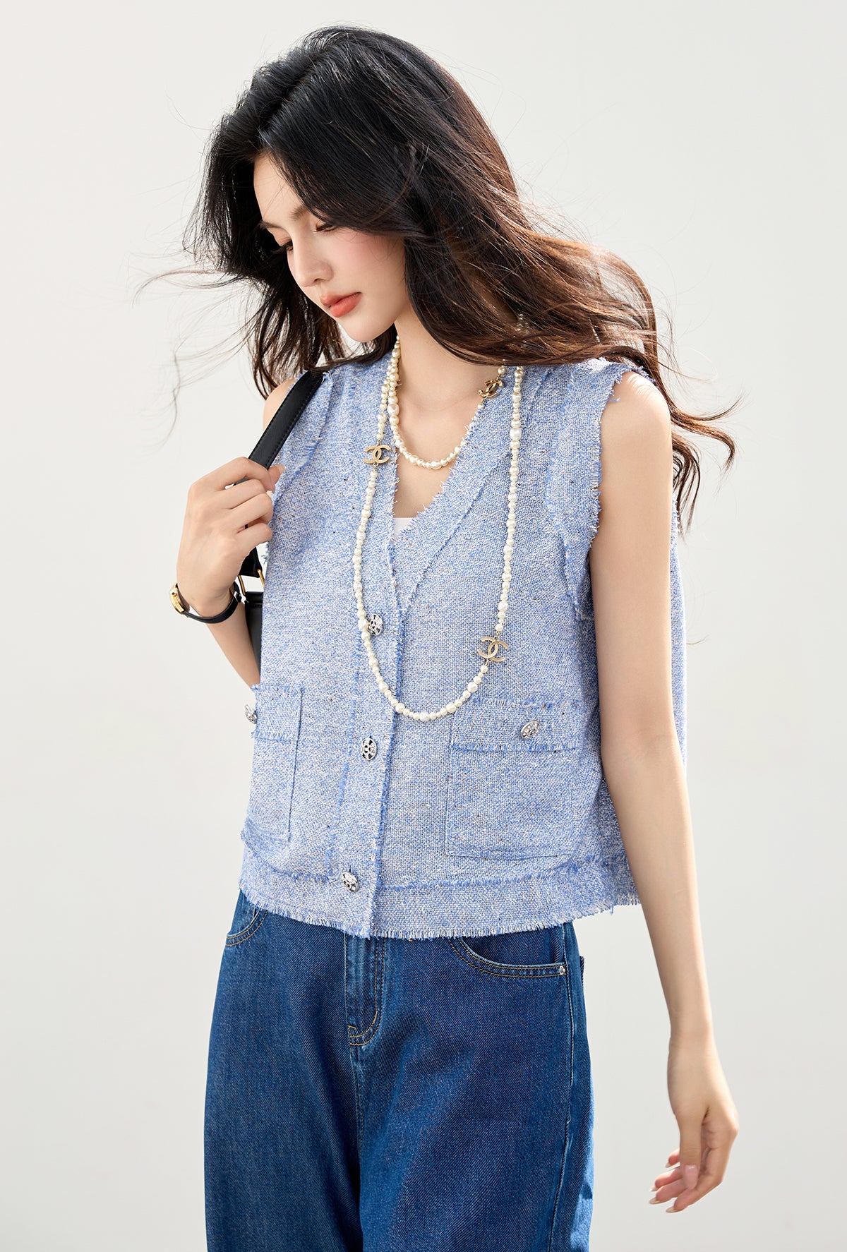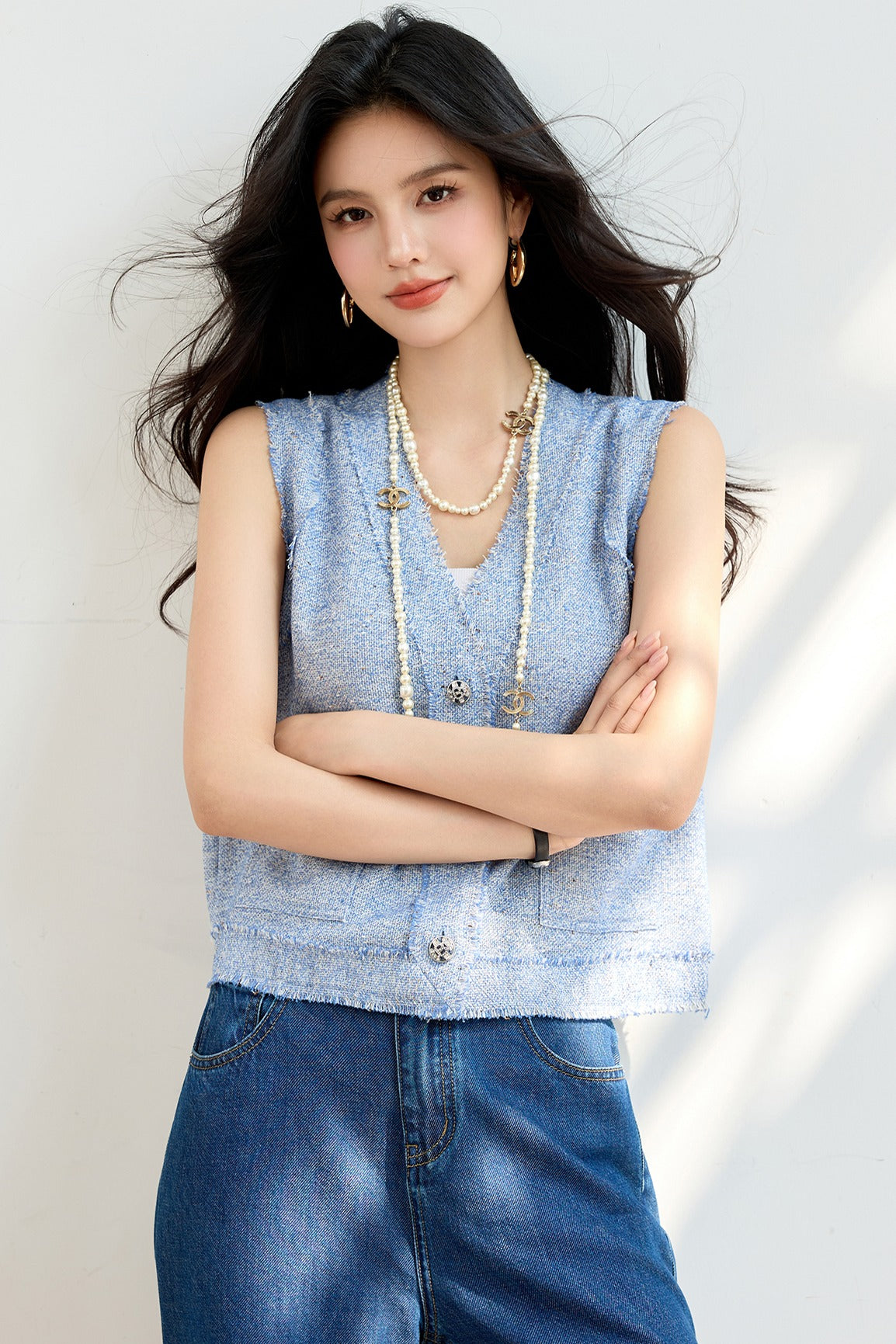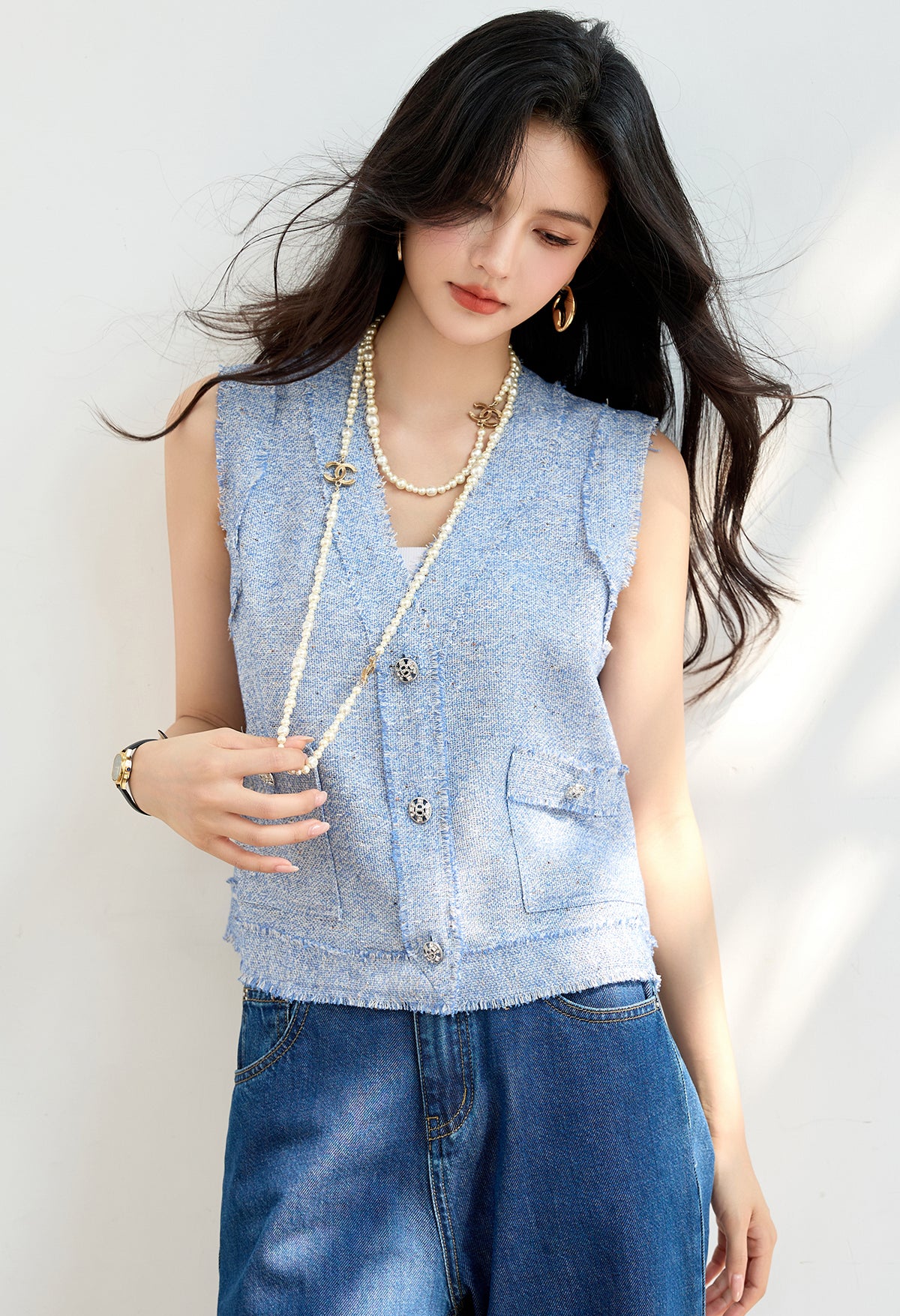 リアルショット◆在庫あり◆Xiaoxiangfengレディースノースリーブ2025サマーVネックプルオーバーブルー起毛ライトウェイトトップ