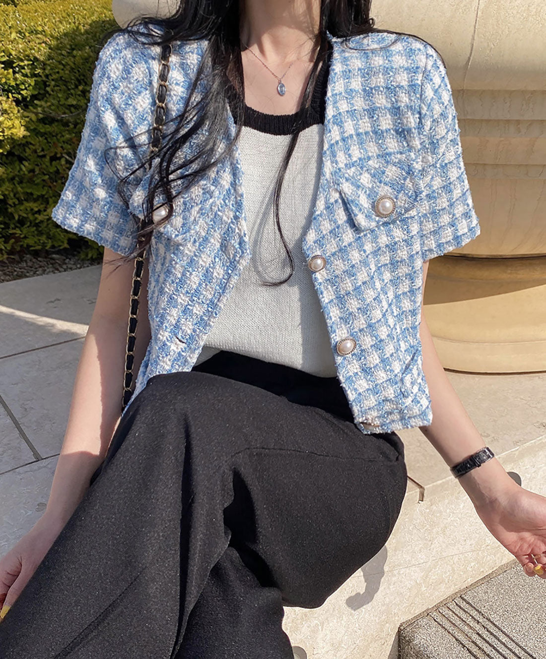 レディストックコリアンニッチシックパールボタンカーディガントップスモールフレグランススタイル半袖チェック柄ショートジャケット