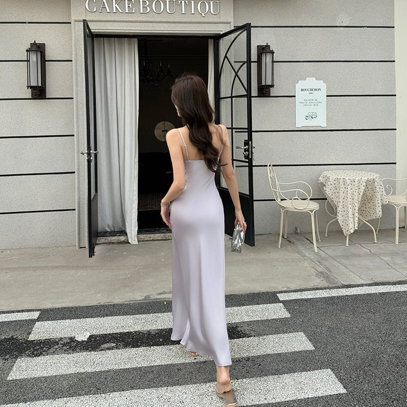 レディストックサテン Vネックサスペンダードレスレディースサマーノースリーブロングスカートウエストスリムフィットロングスカート