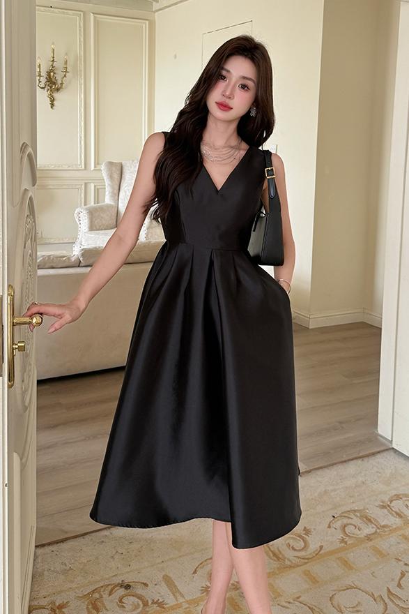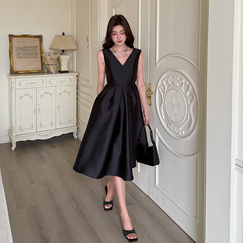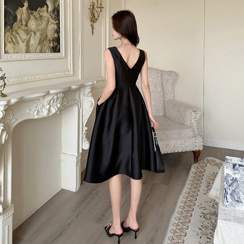 在庫あり2025年夏新作ブラックVネックプレミアムサテンテクスチャドレススリムリトルブラックドレスヘップバーンスタイル
