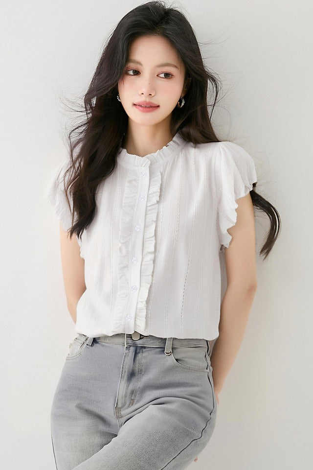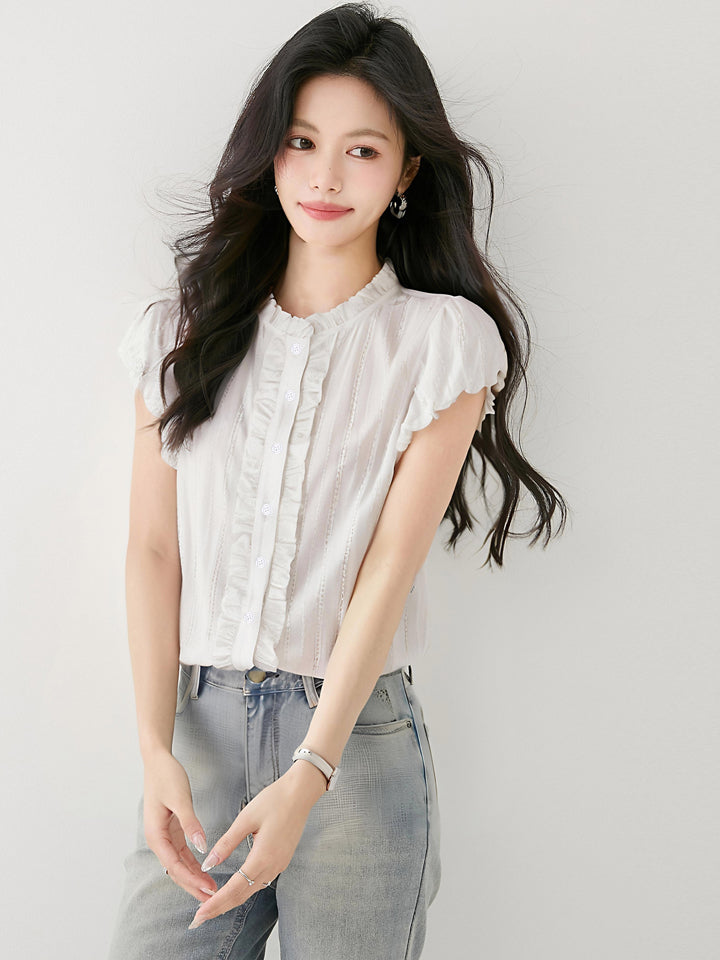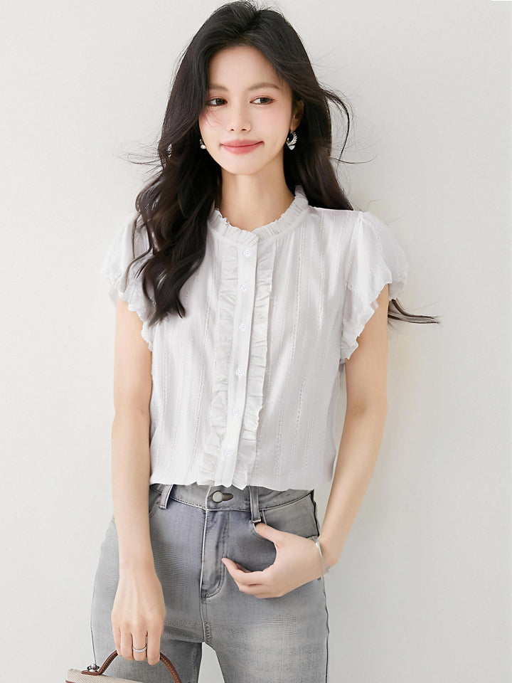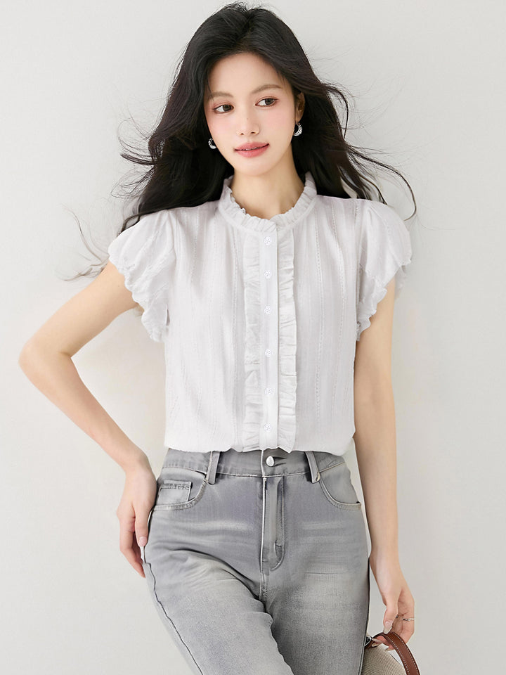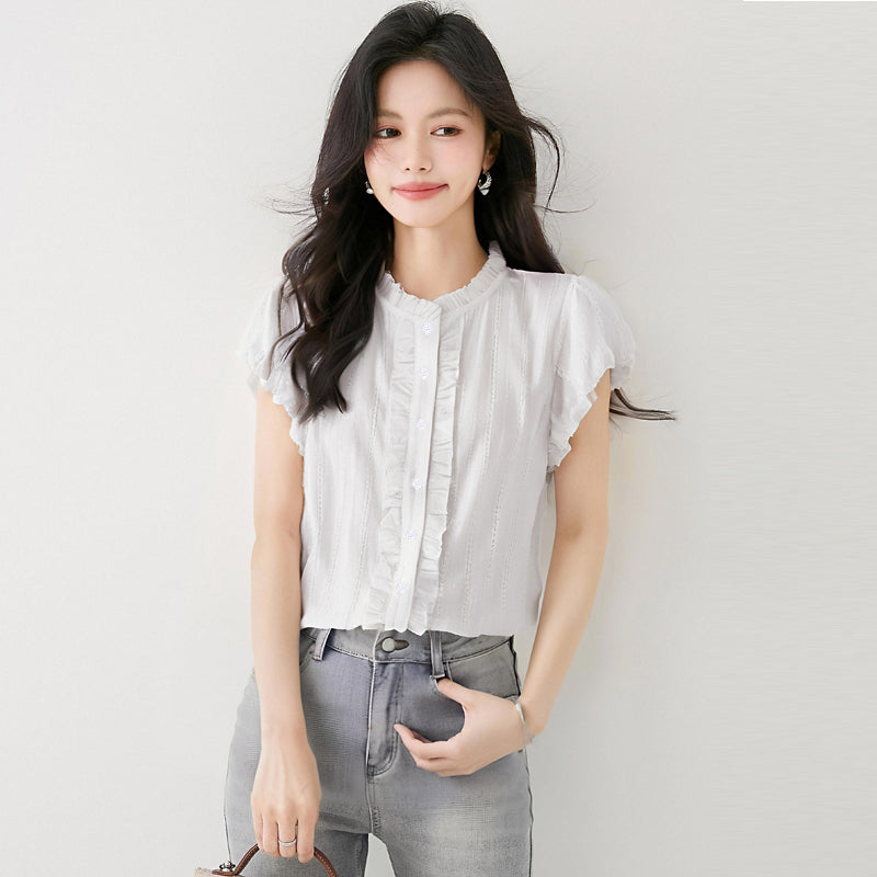 2025年夏新作韓国製スモールフレッシュパフスリーブファンガスサイドスタンドカラージャカード半袖シャツレディーストレンディ