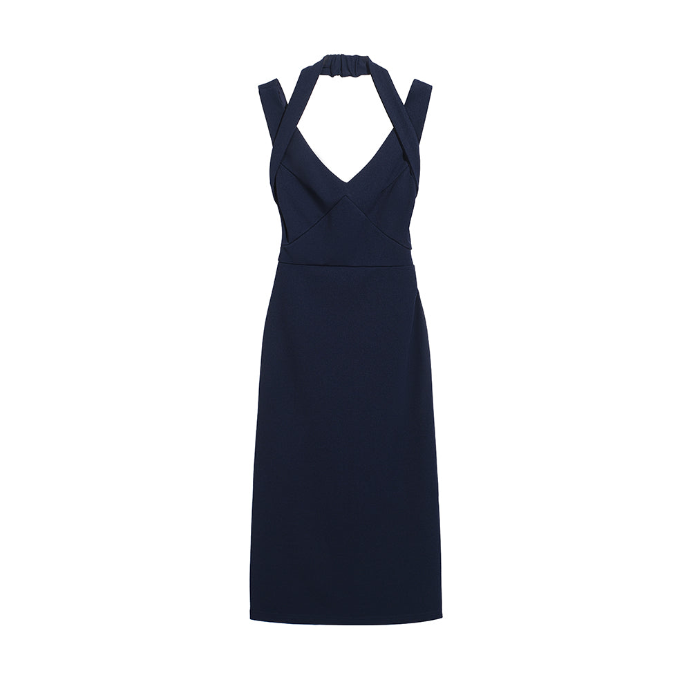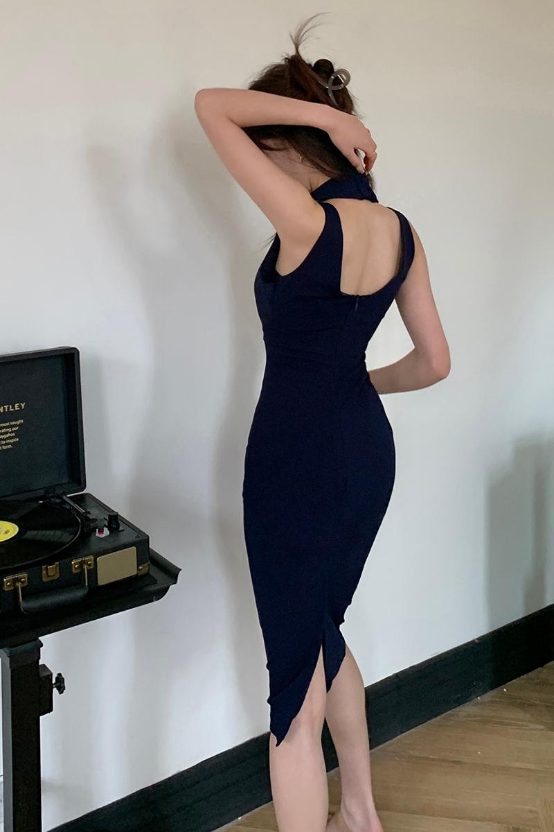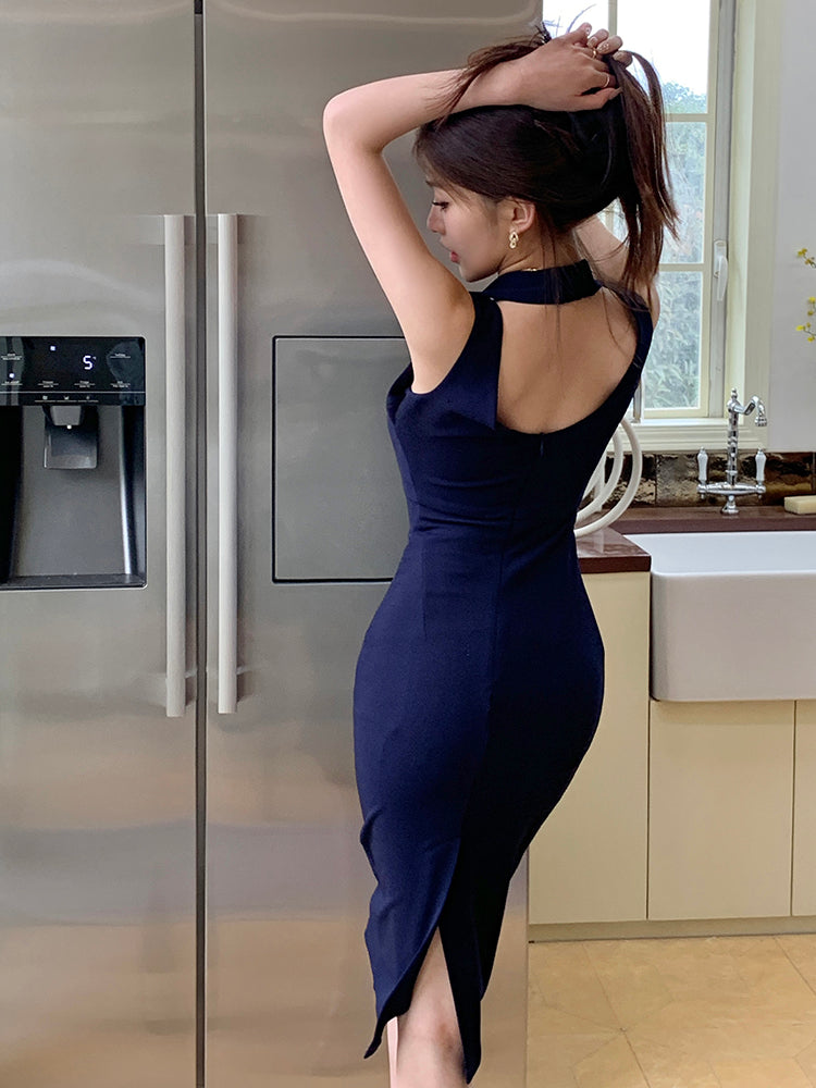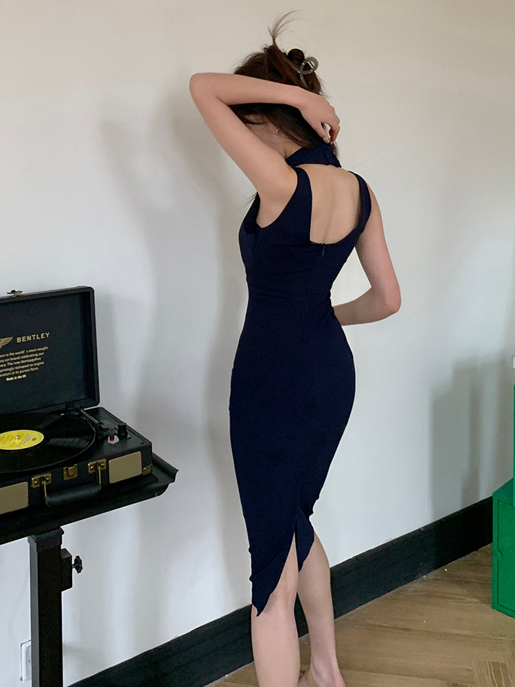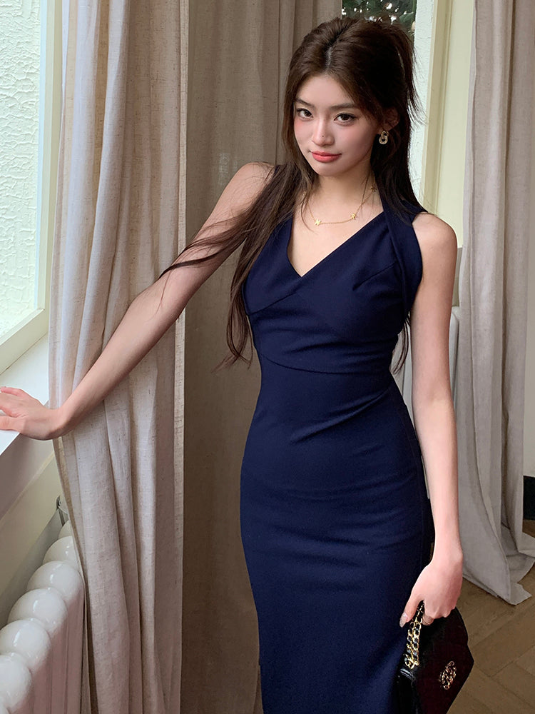 2025年春夏新デザインニッチでスタイリッシュなホルターVネックスプリットバッグヒップスカート女性用スリムフィットドレス