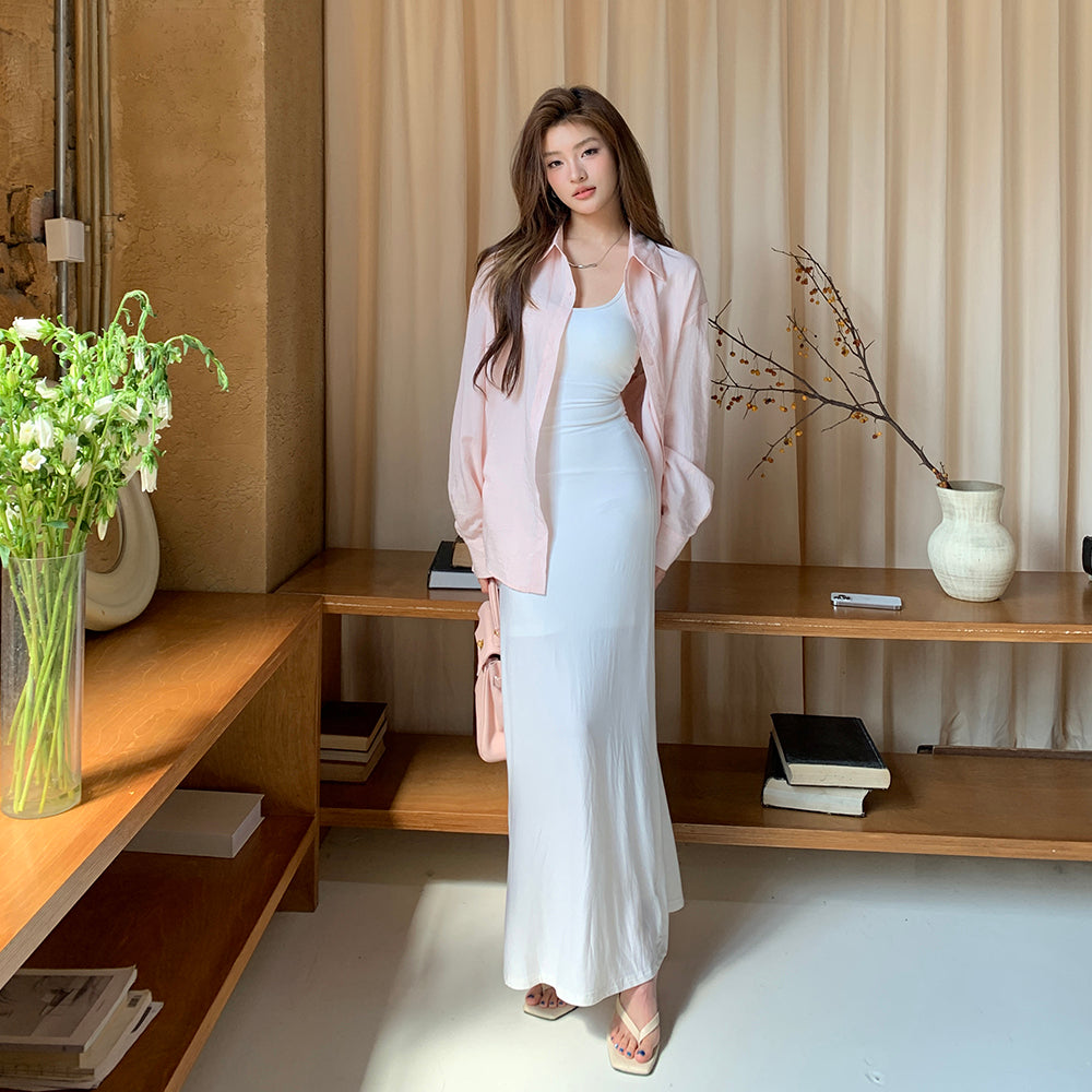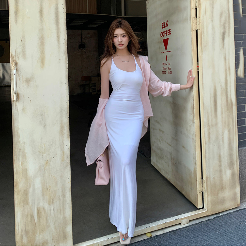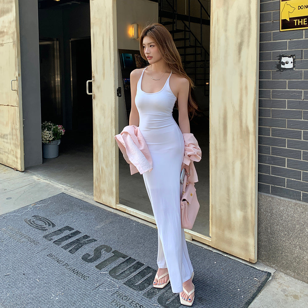 2025年春夏新デザインホローバックサスペンダードレスホワイトドレスAラインロングスカートレディース胸パッド付きリアルショット