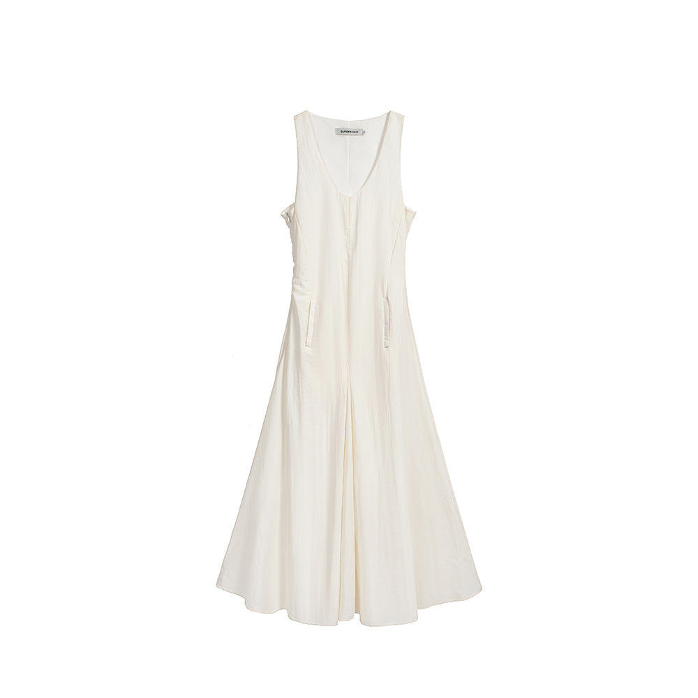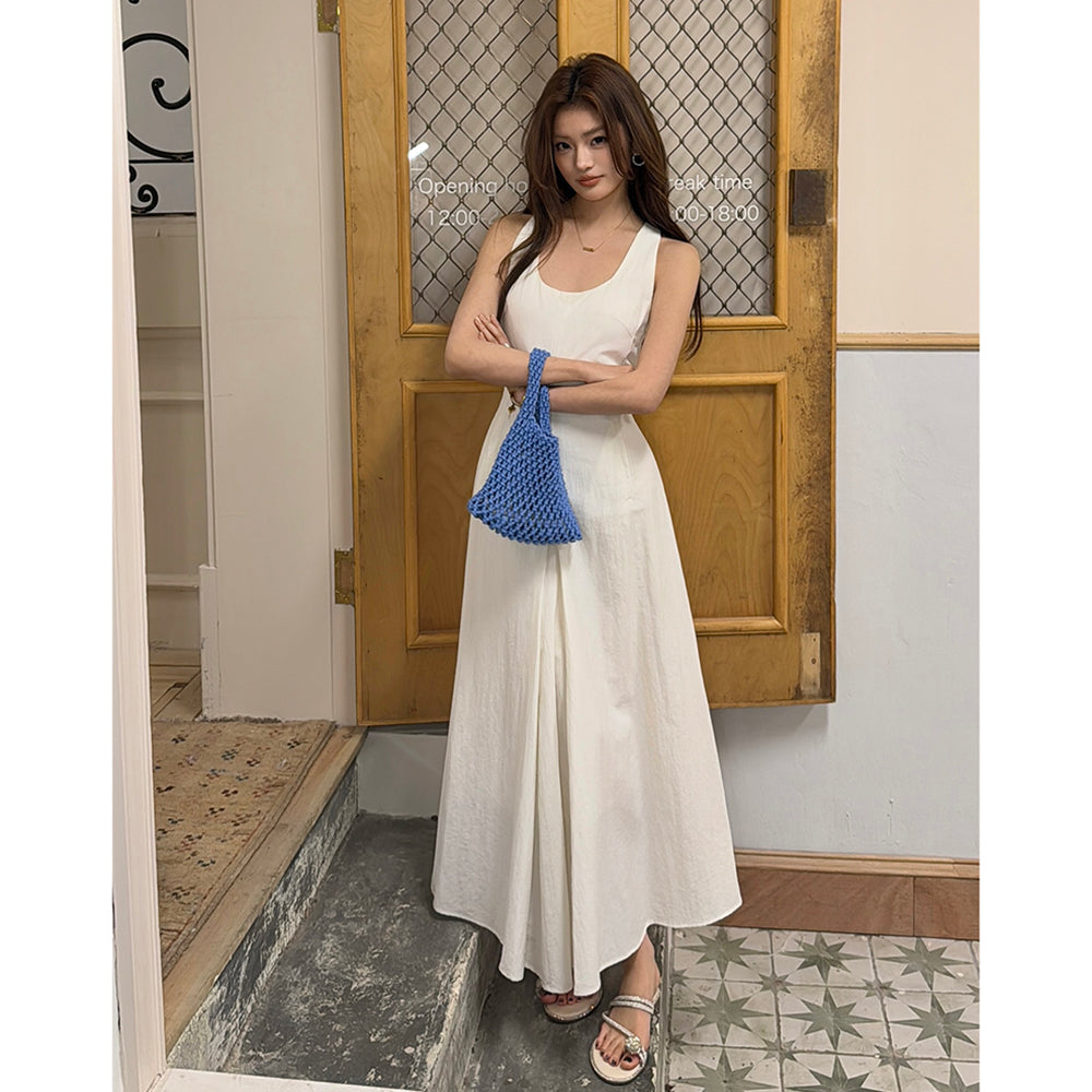 2025年春夏新作シンプルホワイトロングスカート着心地いいデイリーAラインベストプリーツワンピースレディース
