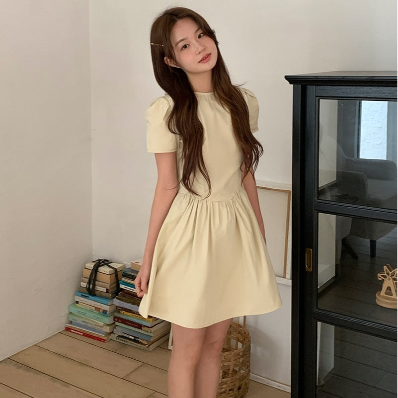 ins韓国夏優しいレトロファッションシンプルなラウンドネックパフスリーブスモールAラインドレス