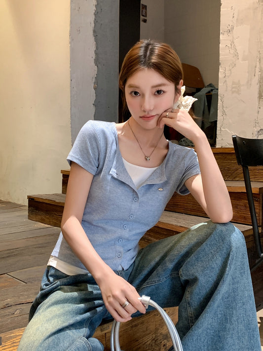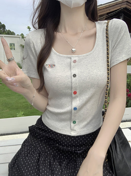 スクエアネックボタンショルダー半袖Tシャツ