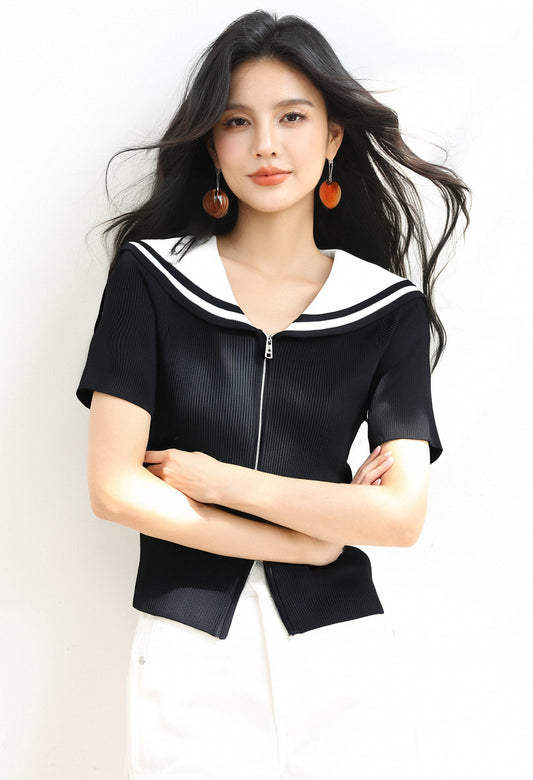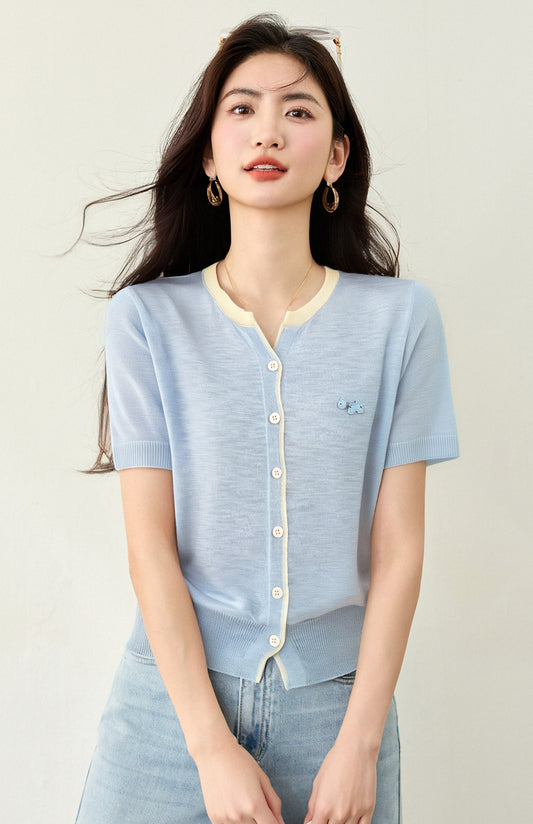 • ちょう結びコントラストカラー半袖セーター