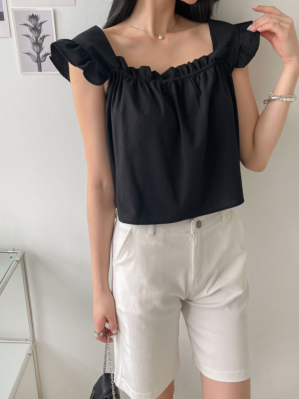 シックな韓国夏クールでスウィートなスクエアネックフリルフライングスリーブバケーションショートベストキャミソール