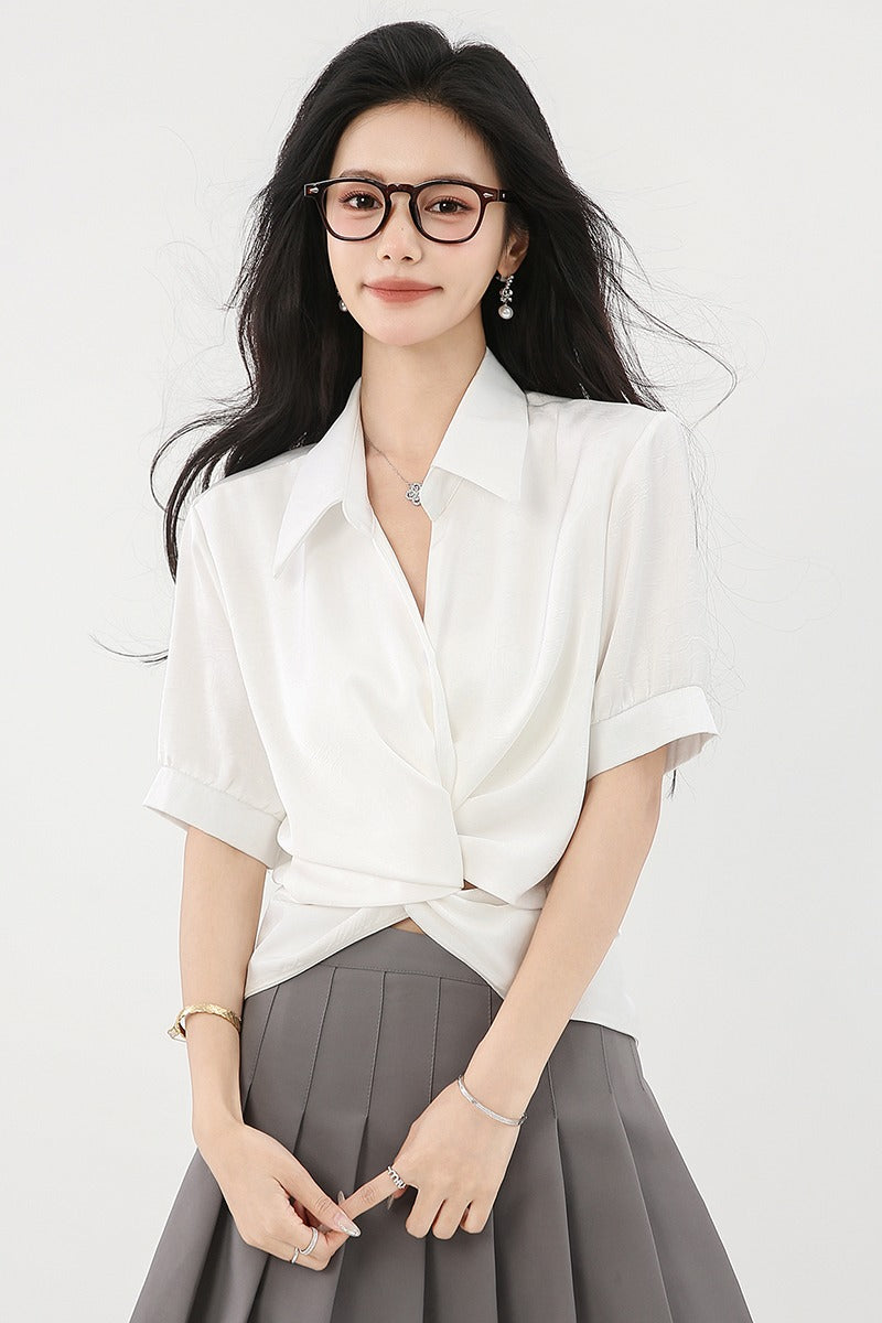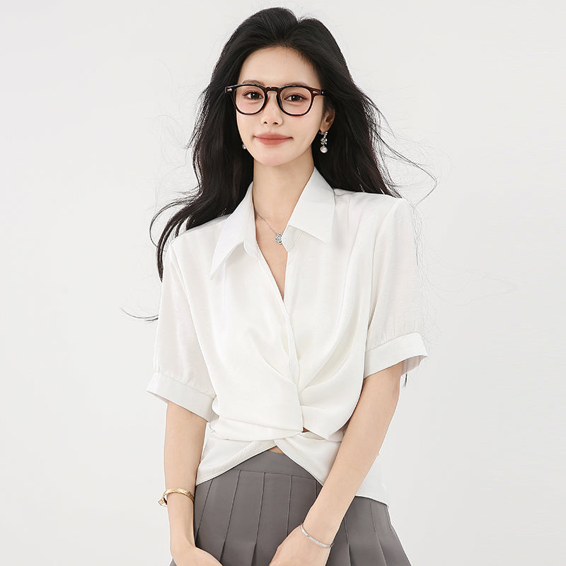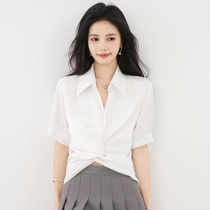 ツイスト半袖ホワイトシャツレディース 2025 サマーニッチショートウエスタンスタイルスモールシャツマルチウェアサテントップス出荷