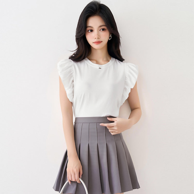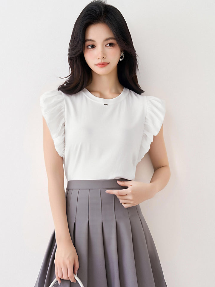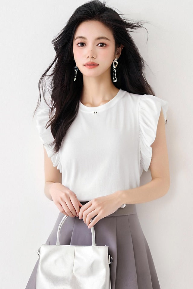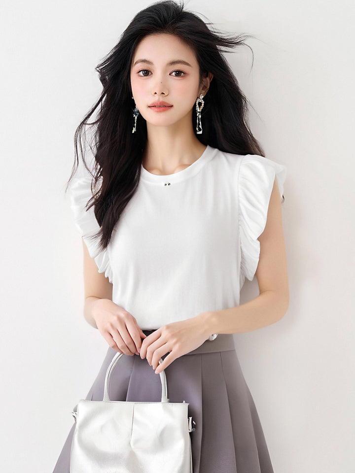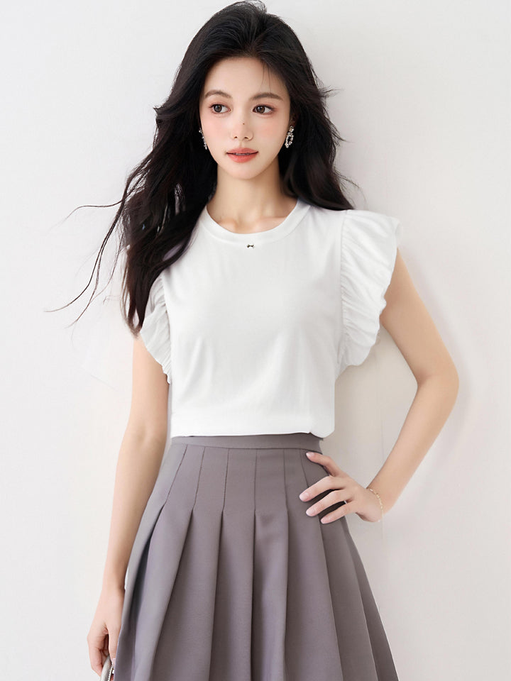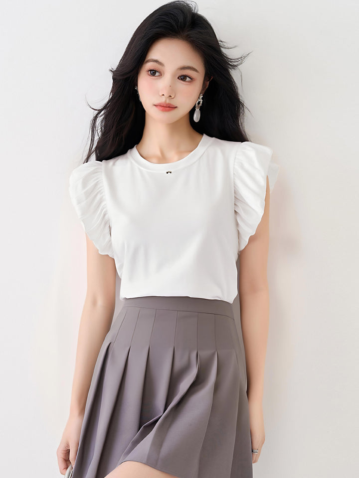フランス製フライングスリーブホワイトラウンドネックTシャツ女性用 2025年夏新作ルーズエイジリダクションテンペラメントスモールシャツトップス発送