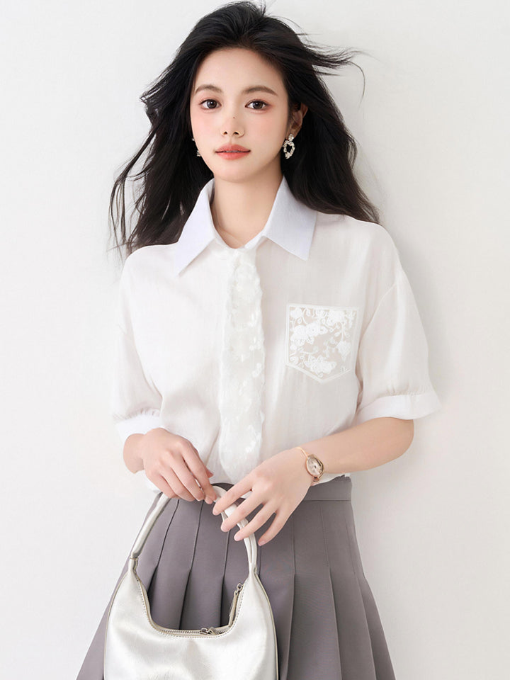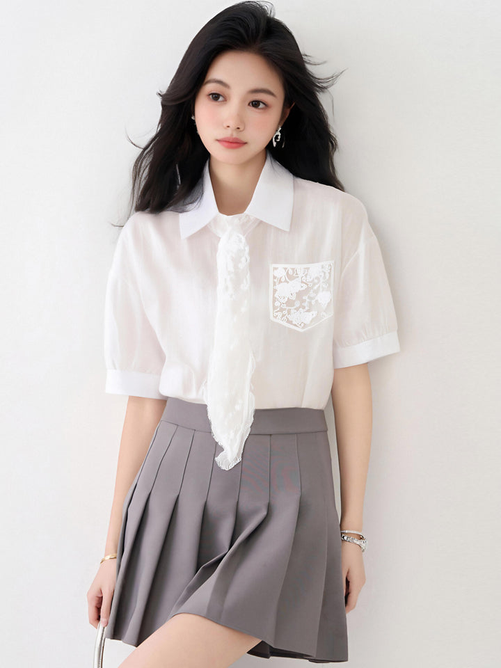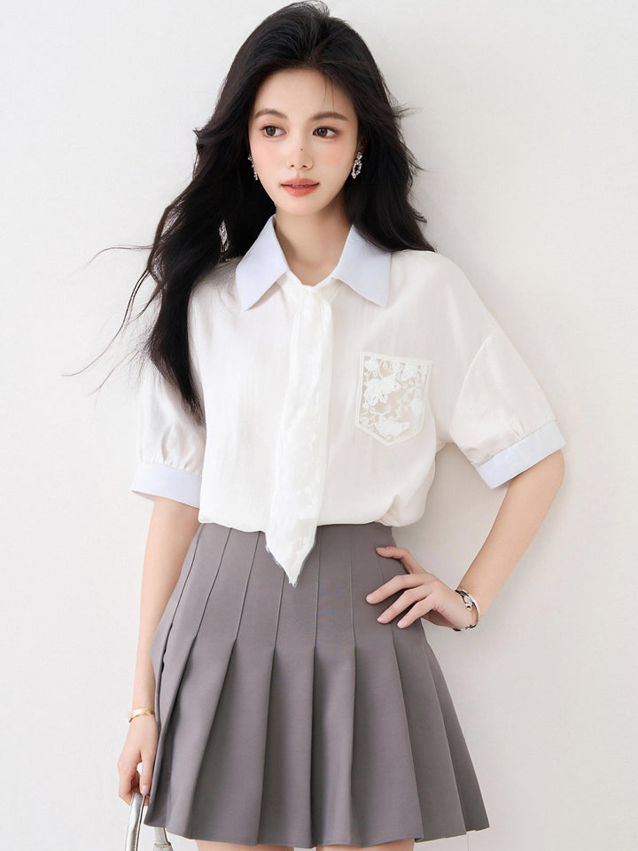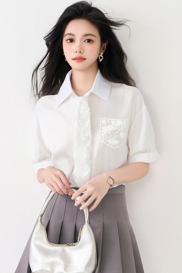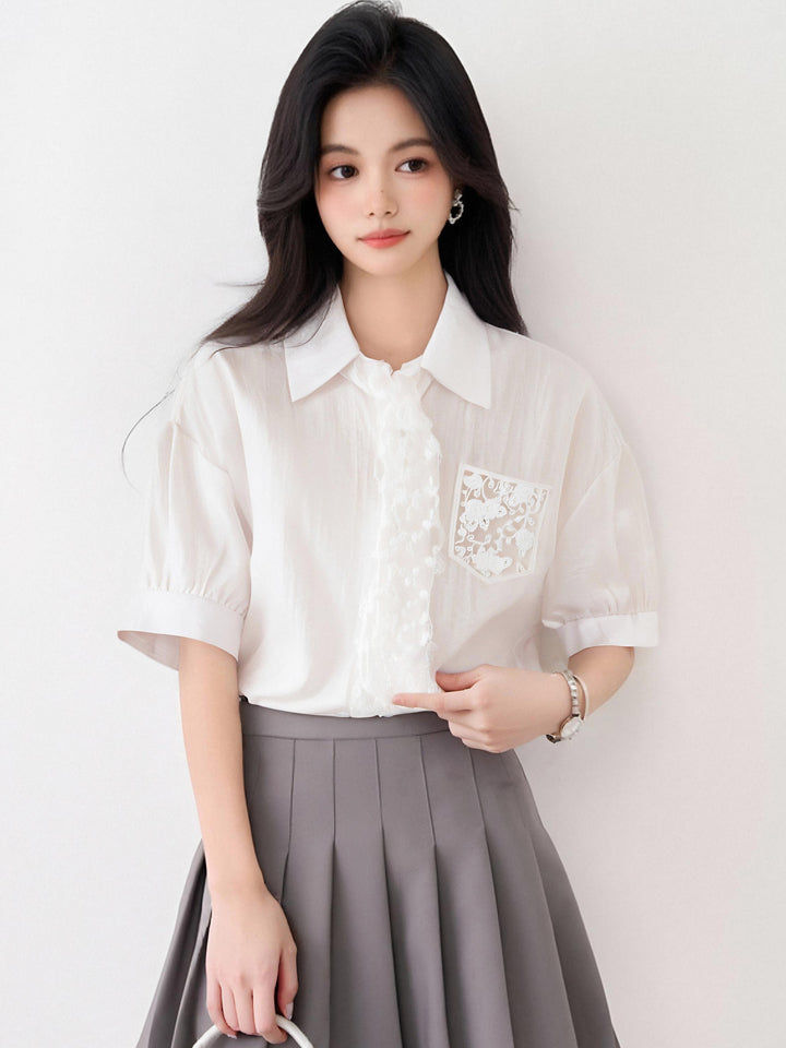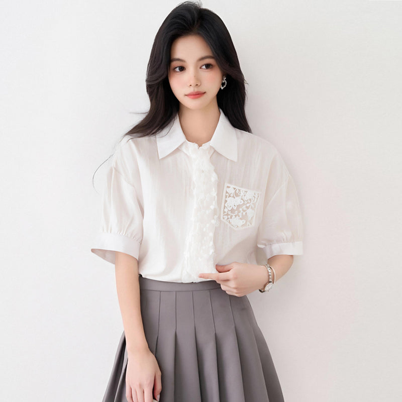 フランス製レースアップ半袖シャツレディース2025年夏新デザインシャツシックトップス発送