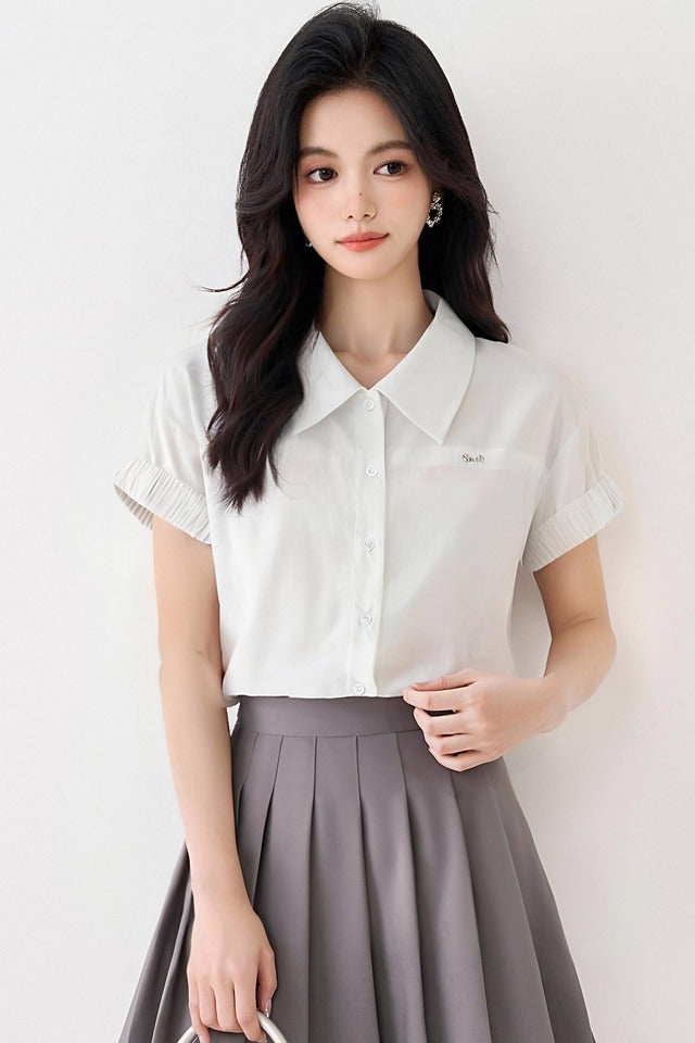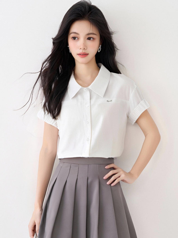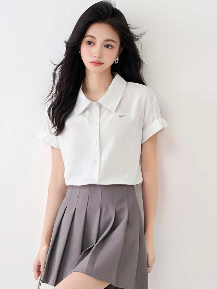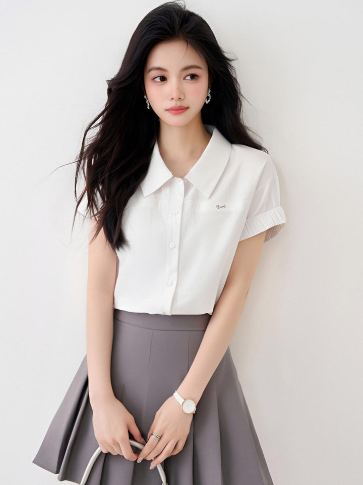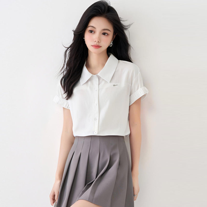 フランス風スモールフライングスリーブミニマリストシャツ女性用 2025年夏新作ショートスリーブシャツカレッジスタイルトップス出荷