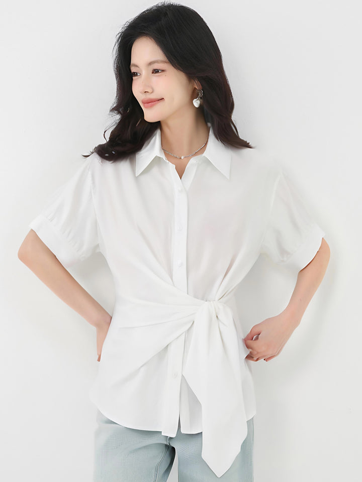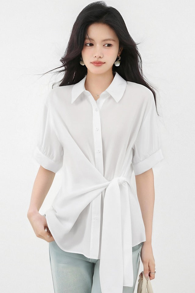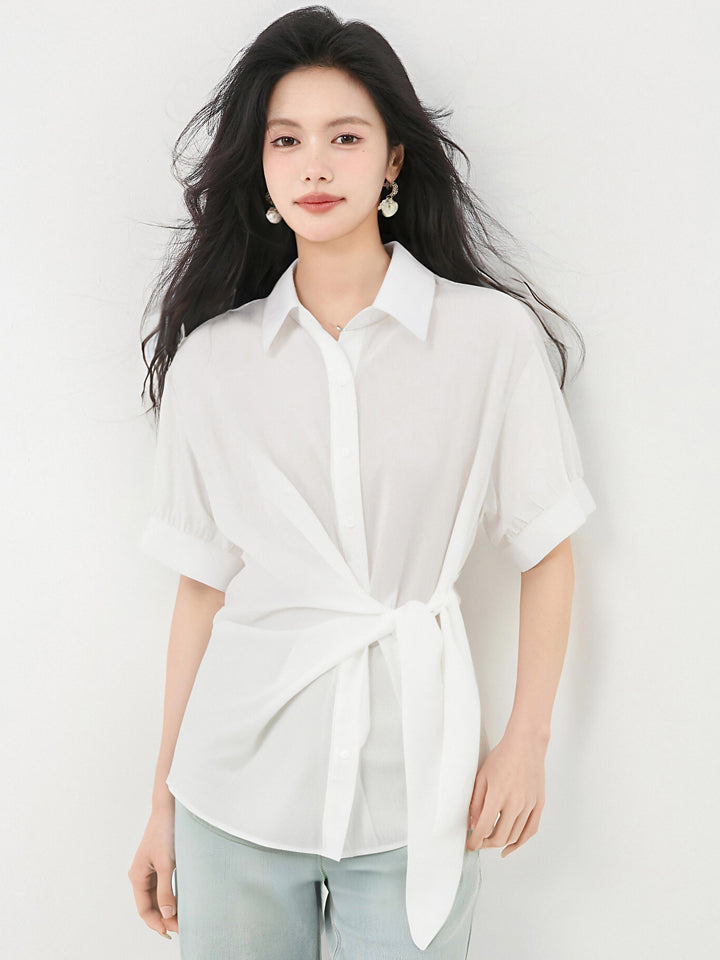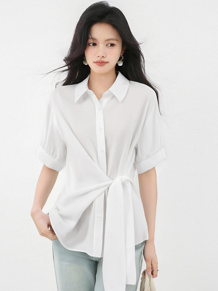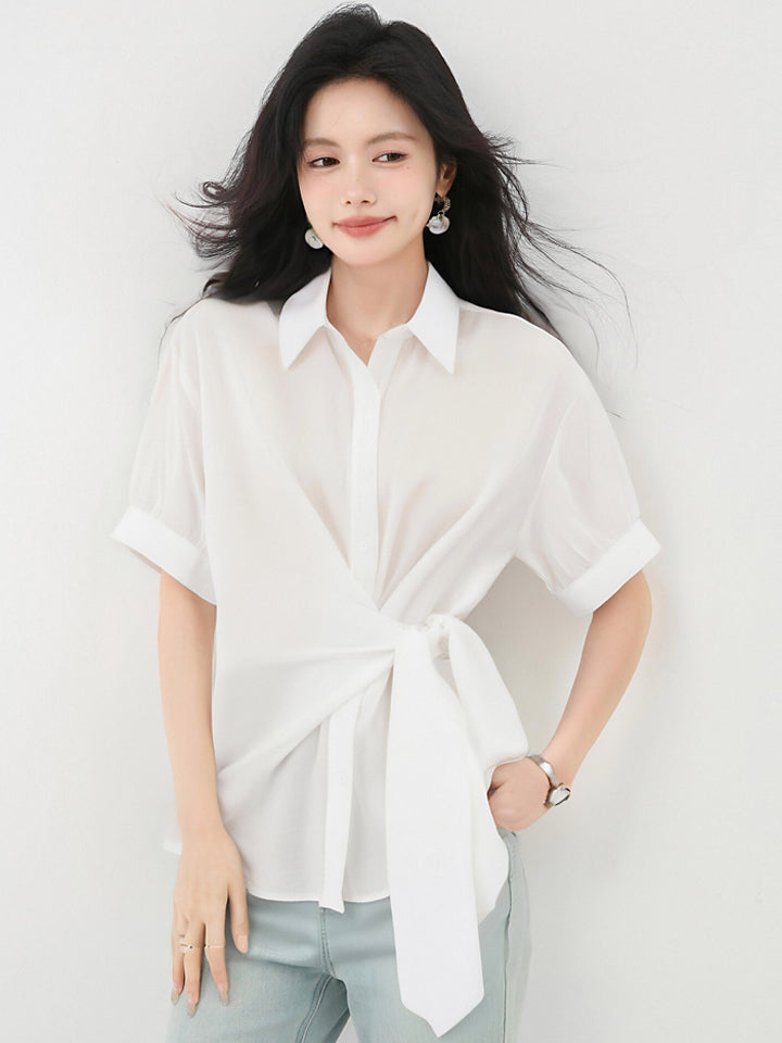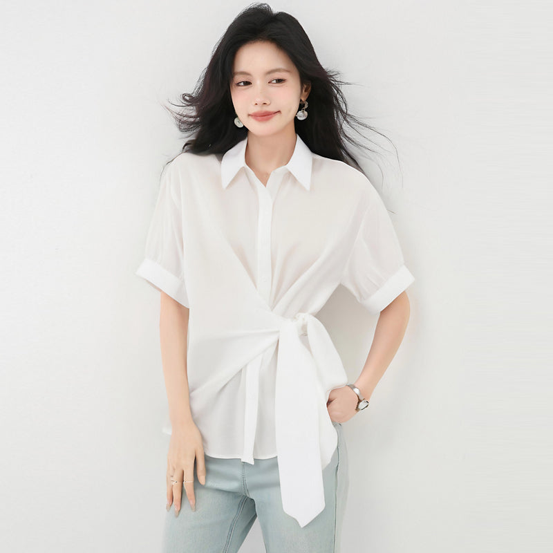 フレンチスタイルホワイトコミューター半袖シャツレディース2025年夏新スタイルレースアップウエストシックトップス発送
