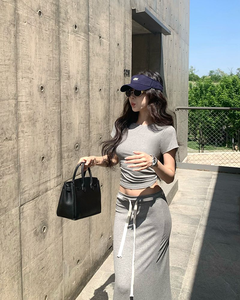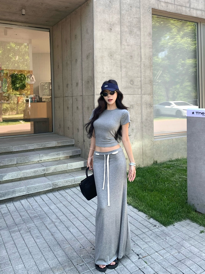 リアルショットお手頃価格リラックスグレーラウンドネックスリムフィットショートTシャツ+ペーパーマンハイウエストストラップロングスカートセット