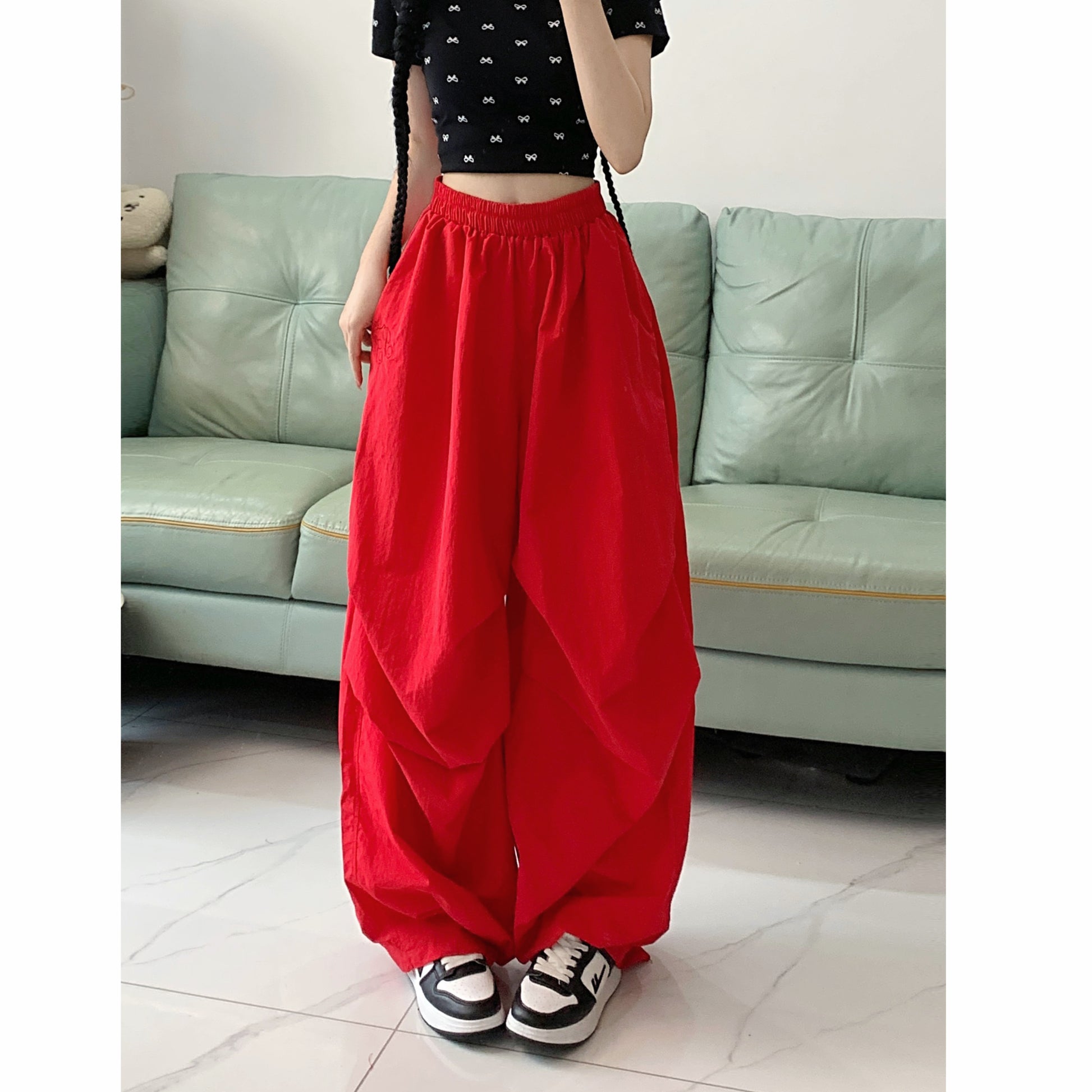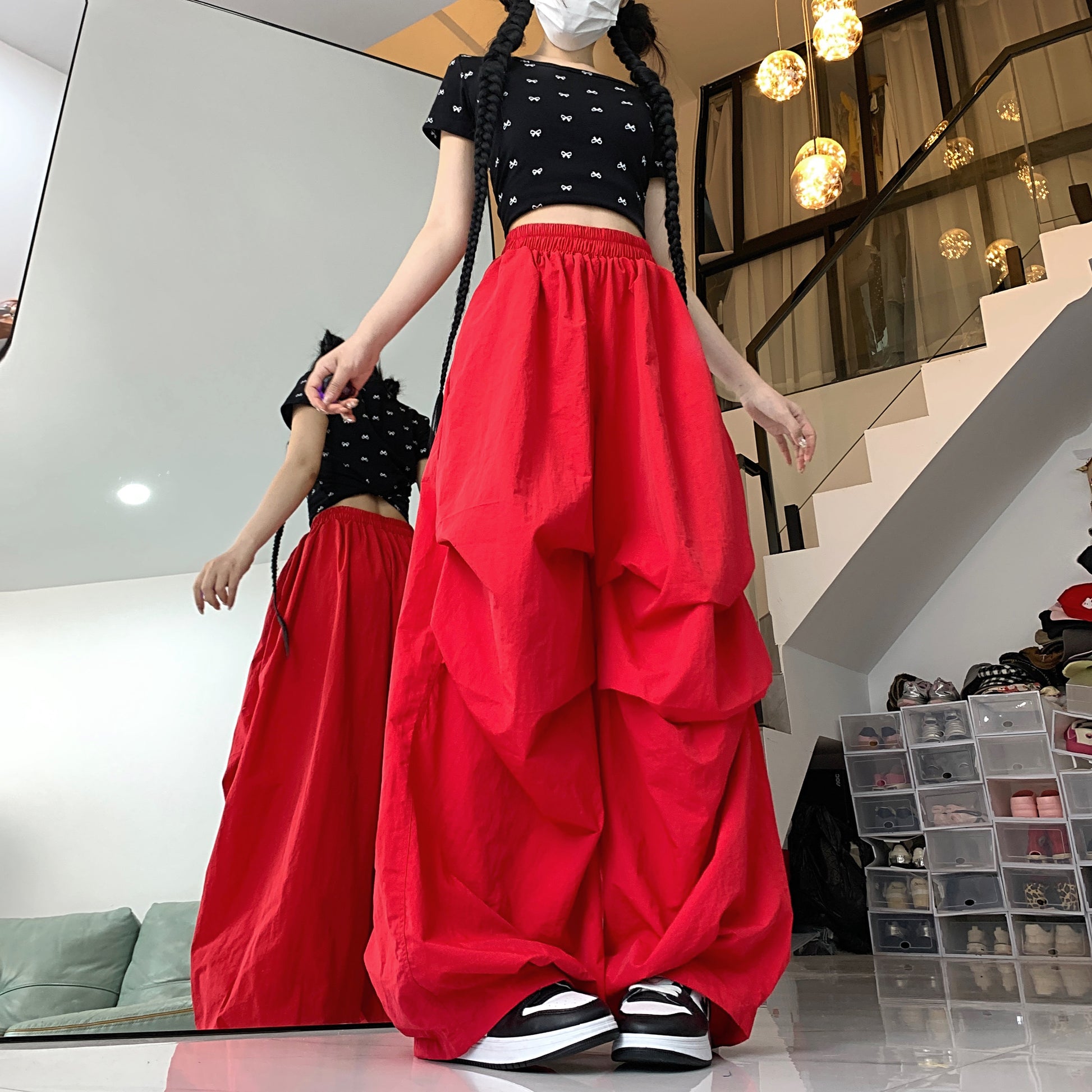 リアルショットアメリカンレッドプリーツワイドレッグ速乾カーゴパンツレディースサマーストリートジャズダンスパンツカジュアルモップパンツ