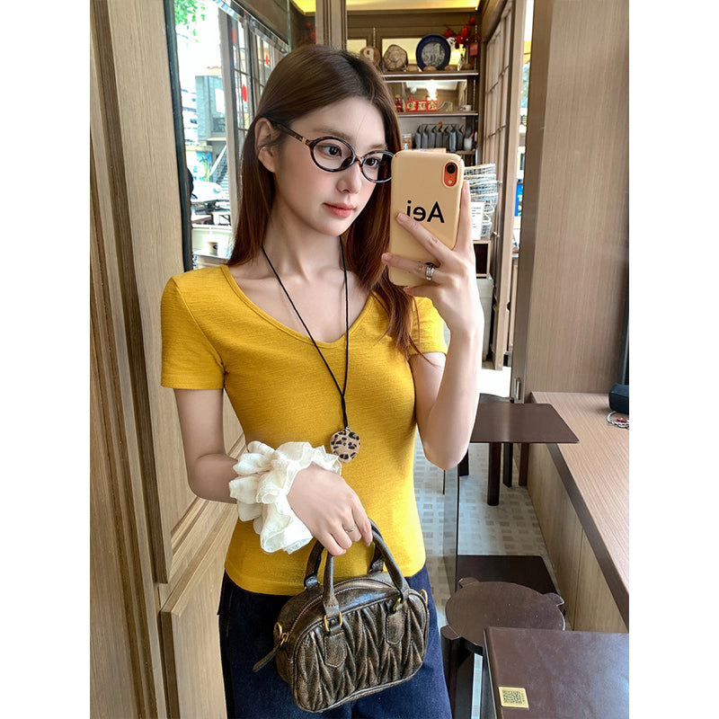 リアルショットイエローショルダー Vネック半袖Tシャツレディース 2025年夏新作スリムフィットショートスモールTシャツトップ