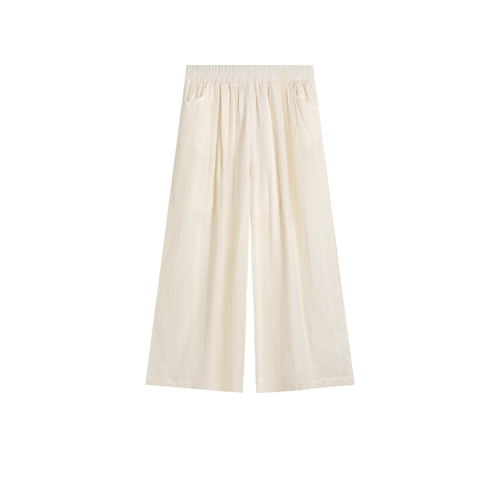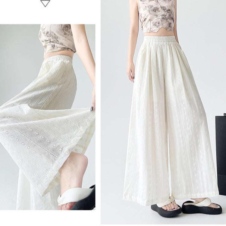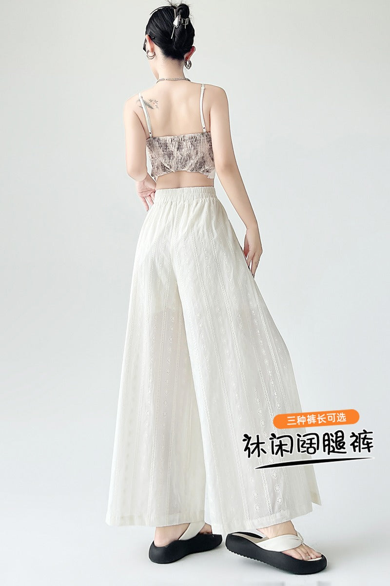 リアルショットコットンリネンレース、伸縮性刺繍、ホロー、スリム、ドレープ、ルーズ、カジュアル、ストレート、ワイドレッグレディースパンツ