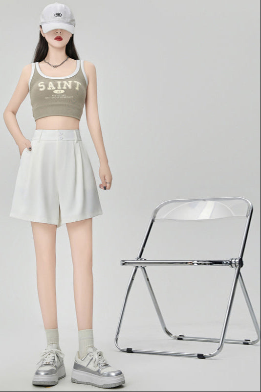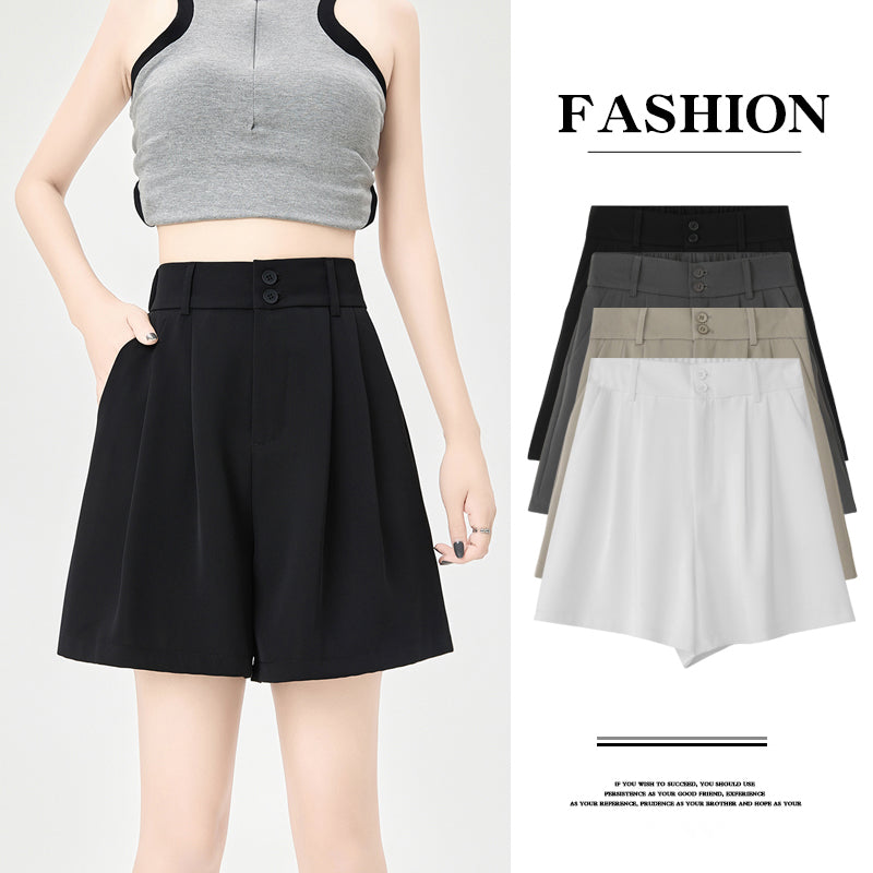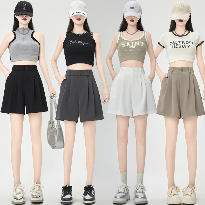 リアルショットスーツショーツ、女性用 Aライン、ルーズ、2025年夏、新作ハイウエスト、肌を覆う、スリム、ブラック、細い、ファイブポイントワイドレッグ