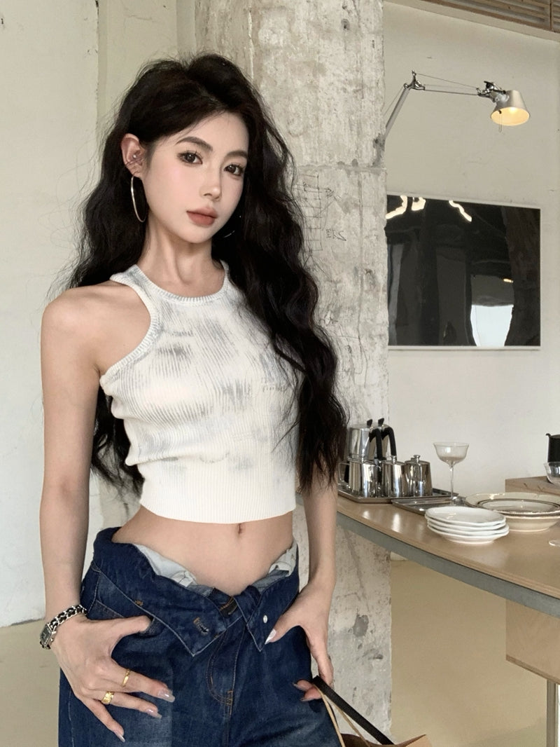 リアルショットリアルプライスサマーホットガールスタイルノースリーブニットベストレディース絞り染め手描きアウターウェアスリムクロップトップ