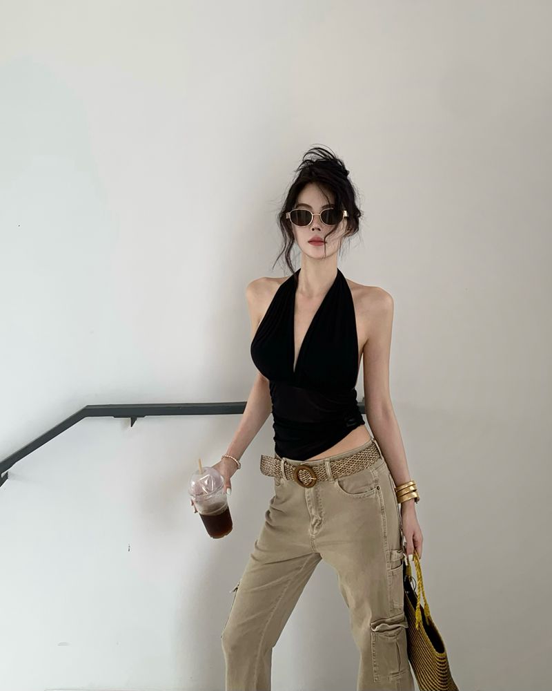 リアルショットリアルプライススプリングホルターキャミソールホットガールセクシーVネックプリーツウエストスリム高弾性メッシュトップ