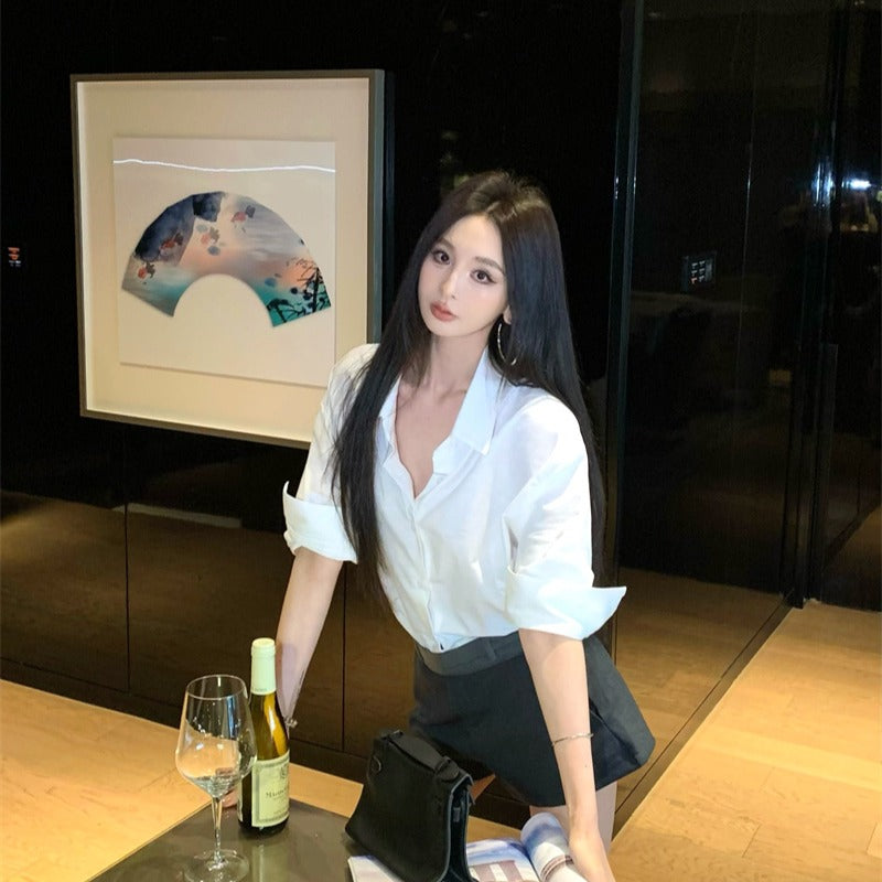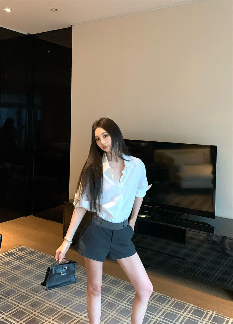 リアルショットリアルプライスレトロアメリカンホットガール着ゆったりシャツトップ+配色ショーツセット