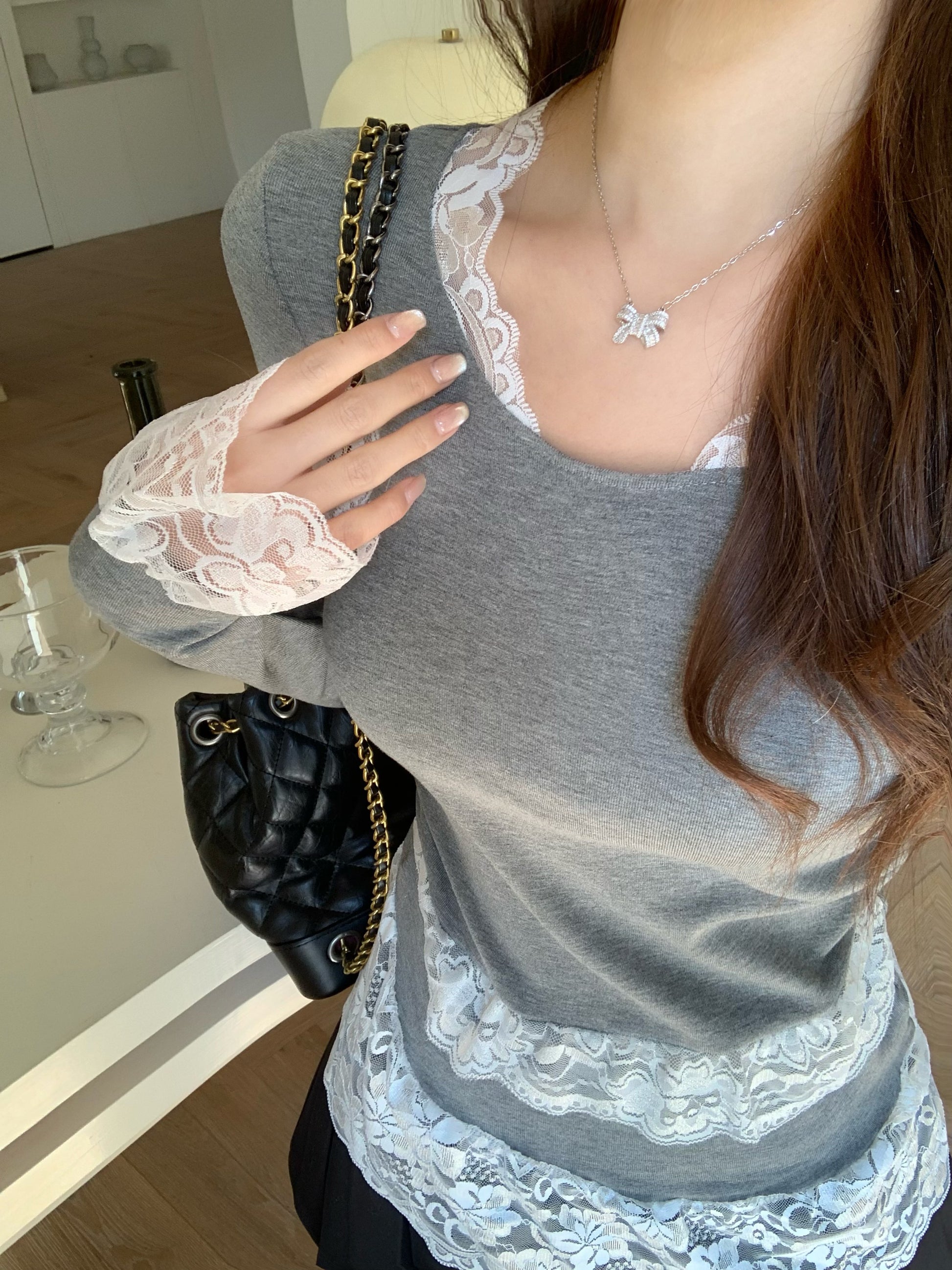 リアルショットレディストック韓国イレギュラーロングスリーブTシャツ春先女性用ピュアデザイアスタイルスリムフィットレースビューティフルトップ