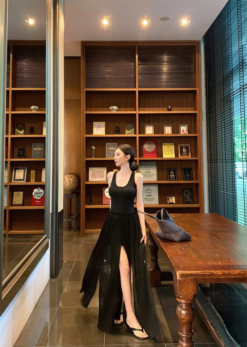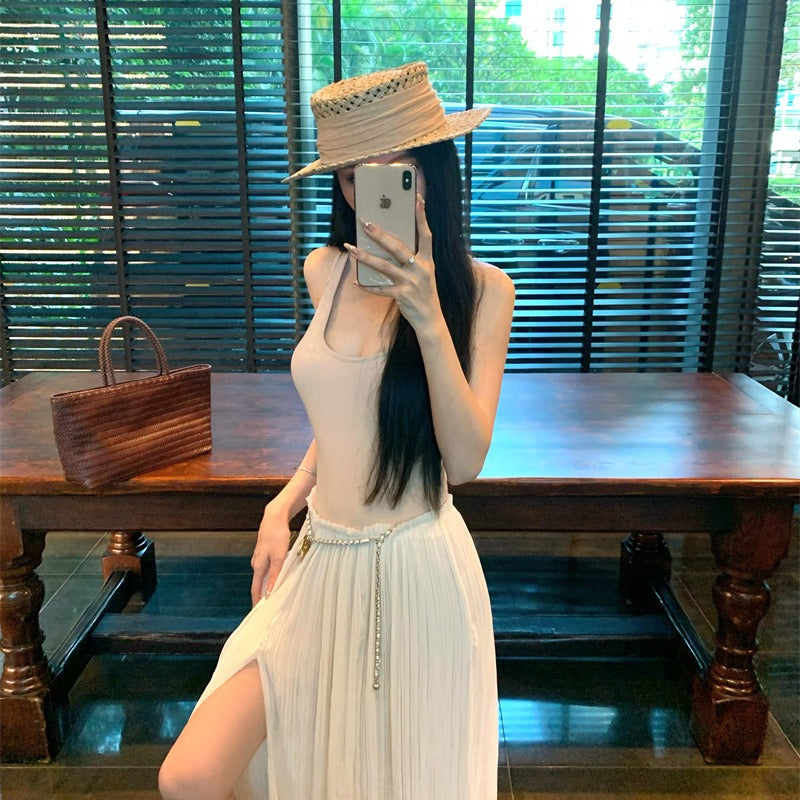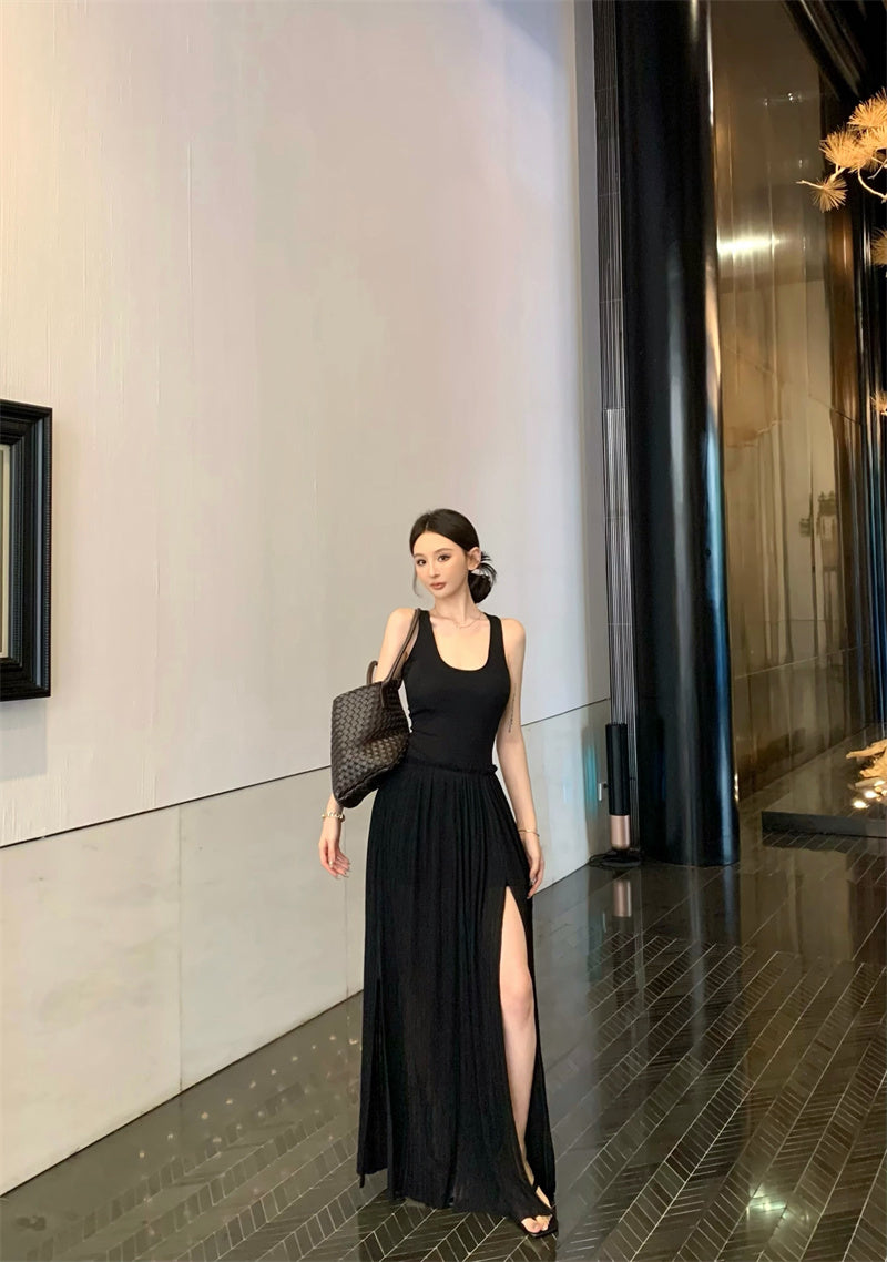 リアルショット、リアルプライス、ニュースタイル、スリム、プリーツ、リップ、イレギュラーロングストレッチサスペンダードレス、ヘビーインダストリースタイル
