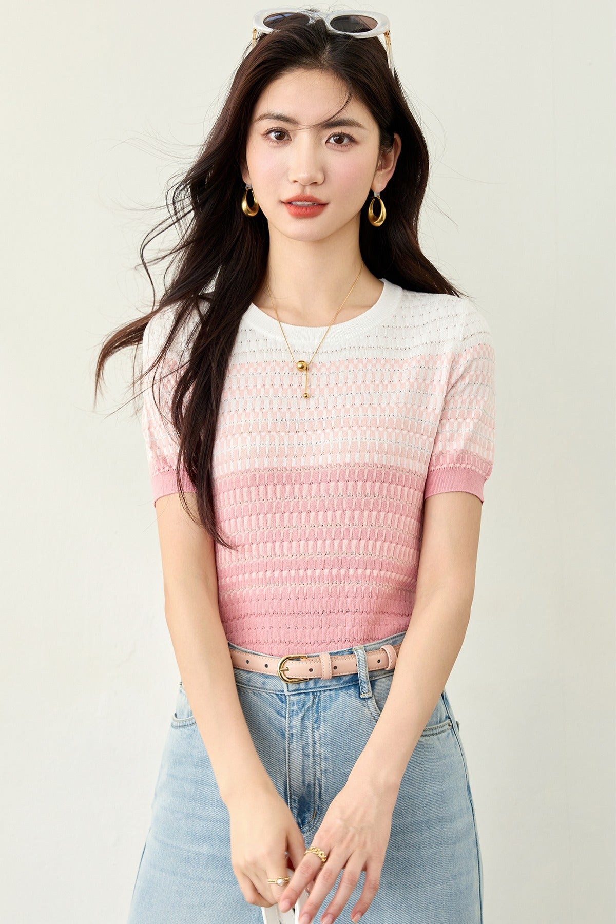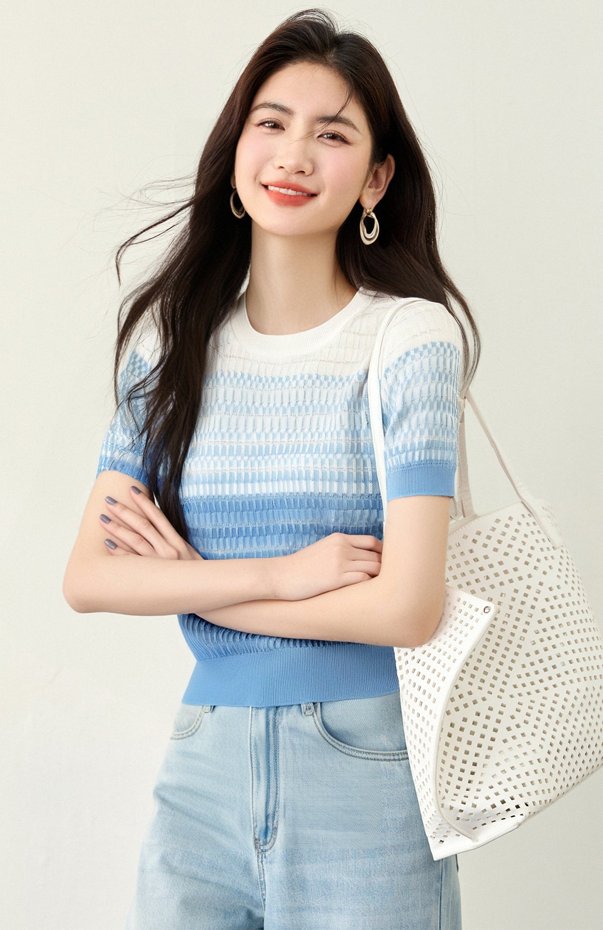 リアルショット◆在庫あり◆グラデーション半袖セーターレディース2025年夏新デザインブルーショートトップ