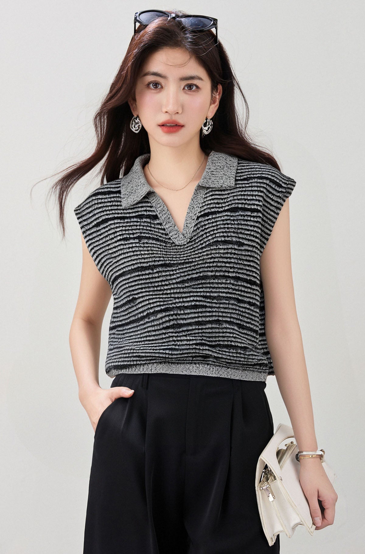 リアルショット◆在庫あり◆ピットテクスチャニット半袖ポロネックベストレディースサマーホローノースリーブトップ